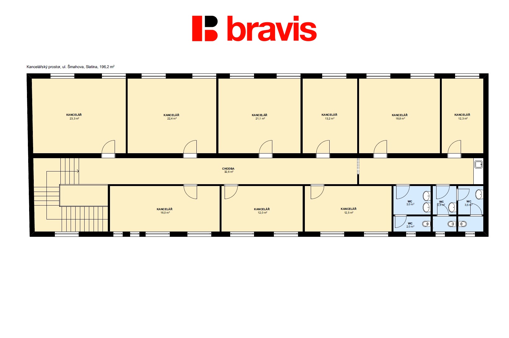 Nabízíme k pronájmu kancelářské prostory o celkové výměře 174 m² v prvním patře budovy na ulici Šmahova, v oblíbené lokalitě Brno - Slatina. Tento prostor je ideální pro firmy hledající flexibilní a dobře dostupné kanceláře s možností pronájmu celého prostoru nebo jednotlivých kanceláří.