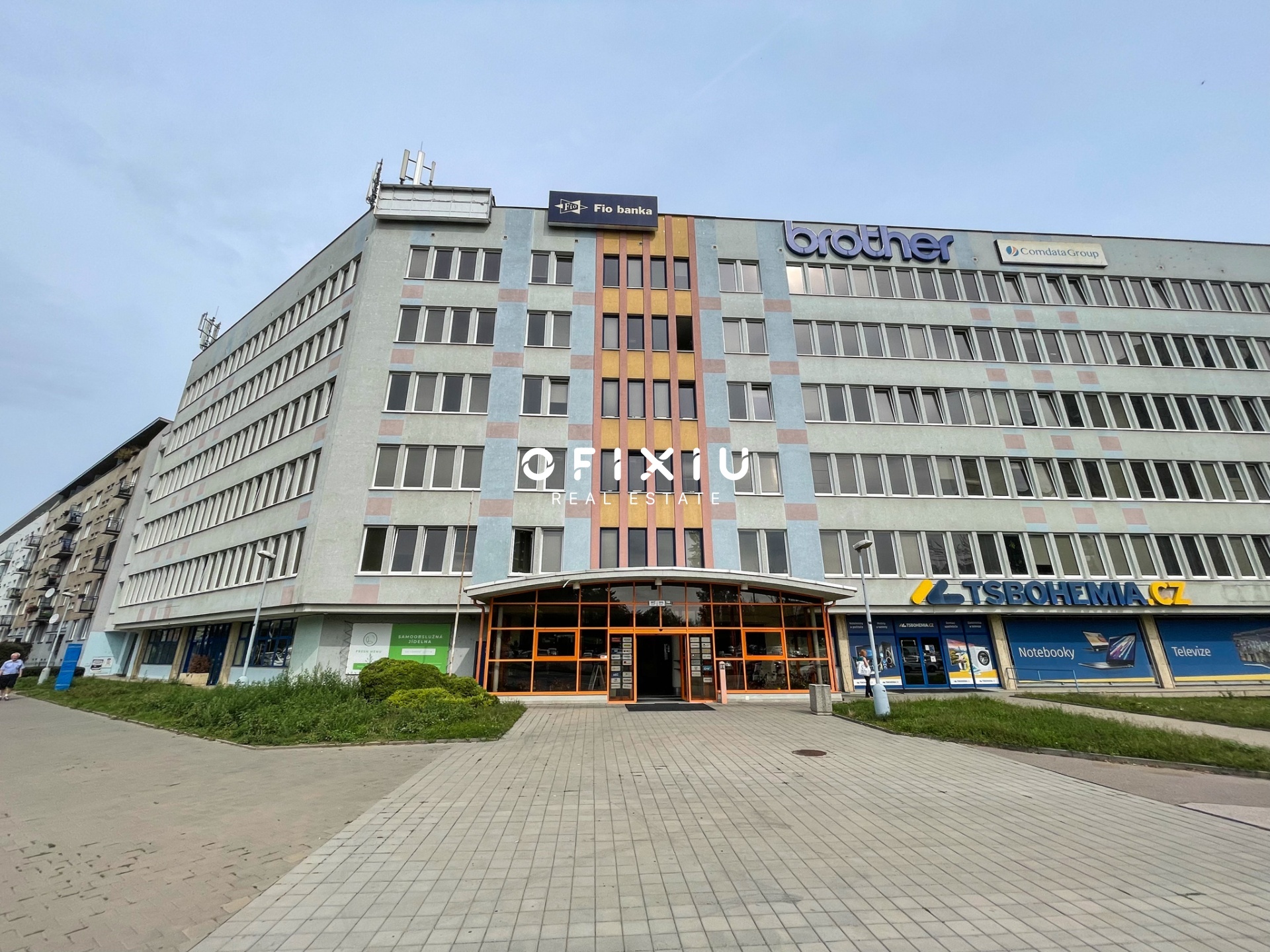 Kancelář s většími okny, klimatizací a sociálním zázemí na patře. Majitel na vlastní náklady prostor vymaluje a položí nové koberce.
