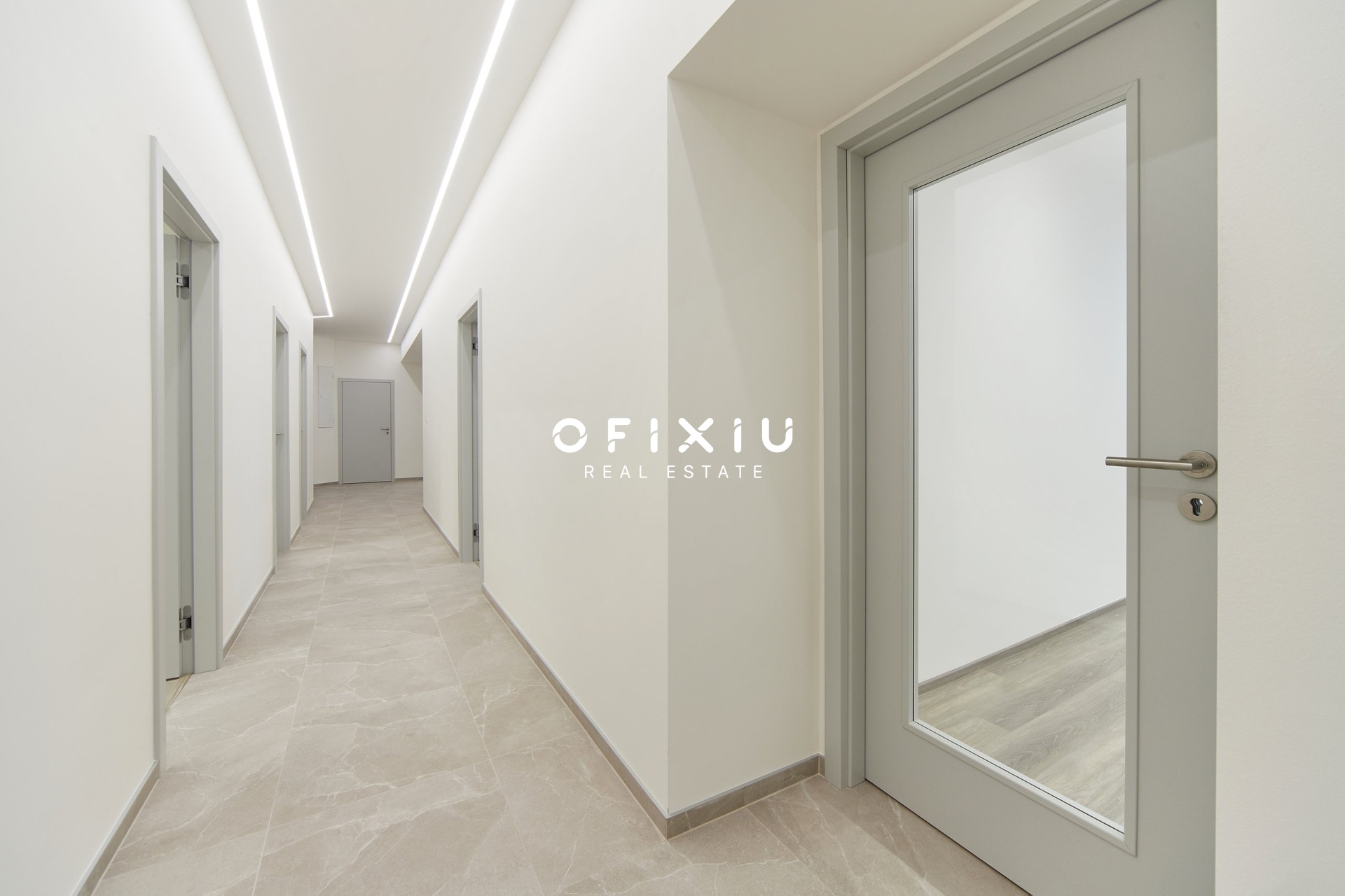 Dispozice zahrnuje několik samostatných kanceláří, open space část, vstupní halu, sociální zázemí a kuchyňku. Prostory jsou vybaveny novými podlahami, dveřmi a osvětlením.
