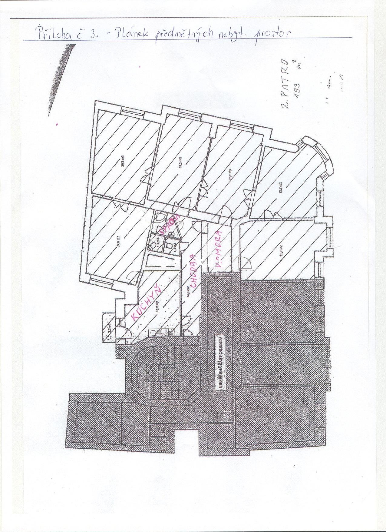 Nabízíme k pronájmu prostorné nebytové prostory o celkové výměře 193 m², které se nacházejí ve 2. patře domu na rohu ulic Kobližná a Kozí v samém centru Brna. Prostory jsou již více než 15 let využívány jako kanceláře, konkrétně jazyková škola. Ve druhém až šestém patře domu se nacházejí výhradně byty, přičemž tento jediný prostor je využíván k nebytovým účelům.