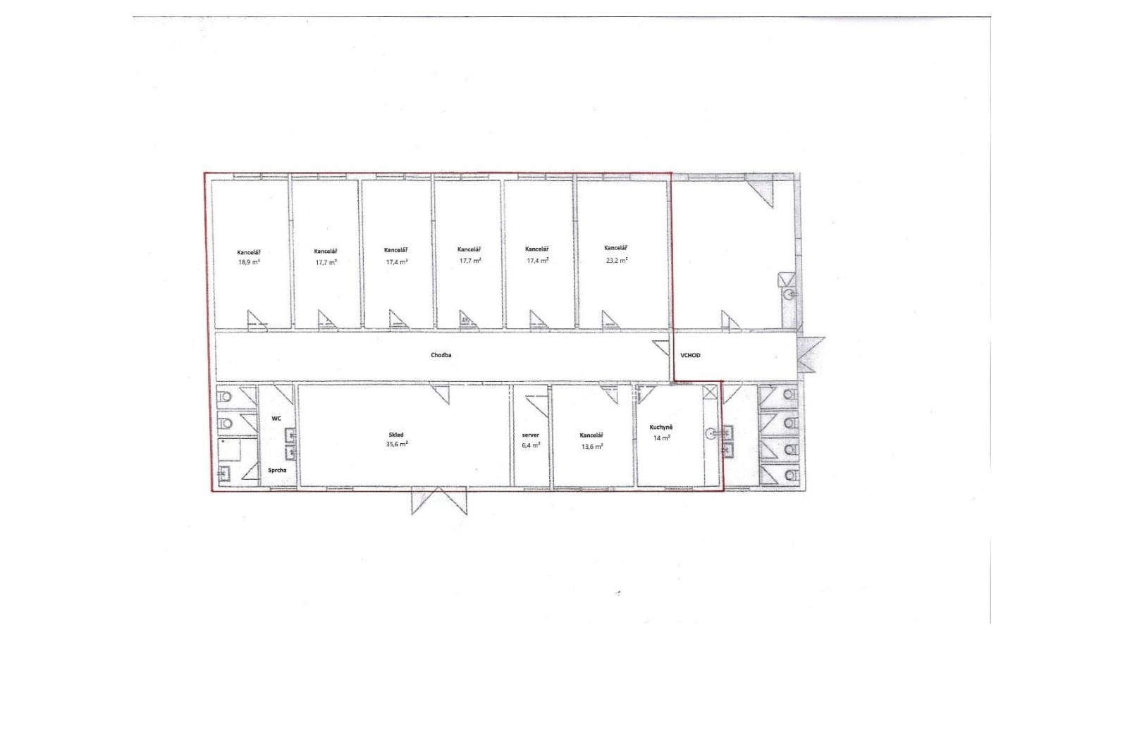 Nabízíme k pronájmu prostor po kompletní rekonstrukci, které tvoří samostatný a uzavřený celek s vlastním vstupem. Celková výměra činí 204 m² a zahrnuje sedm samostatných klimatizovaných kanceláří různé velikosti, prostornou chodbu, sklad s nakládací rampou, serverovnu se zabezpečením, kuchyňku, toalety a vlastní sprchu. Součástí je také sklad o výměře 35,6 m² s vraty a plošinou, který umožňuje pohodlnou manipulaci se zbožím.