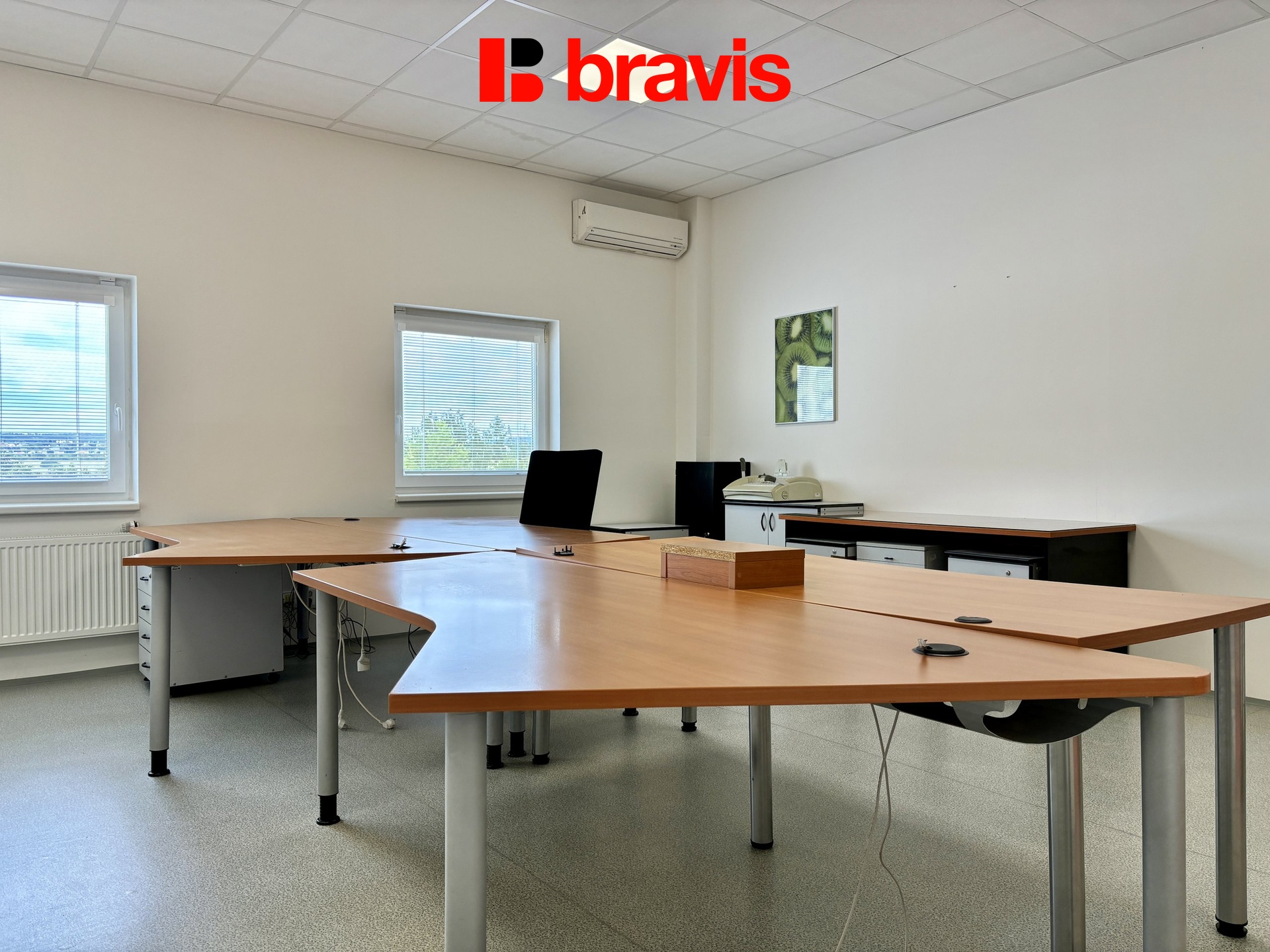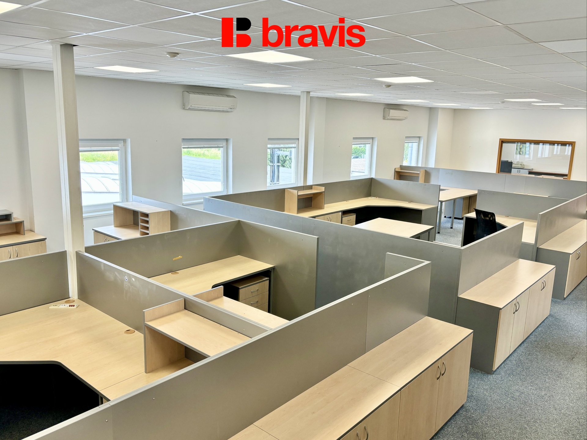 Klimatizované kanceláře o celkové velikosti 257 m2 se nachází v 1. NP budovy, skládají se z jedné velké místnosti o velikosti 172 m2 a dvou místností o velikosti 14,4 m2 a 28,9 m2, které jsou od hlavní otevřené části odděleny dveřmi a okny, mohou sloužit např. jako zasedací místnosti. Kanceláře jsou zařízeny nábytkem, po dohodě je možné je i vyklidit, okna jsou vybavena žaluziemi, na podlaze je položen koberec. Kanceláře se rozprostírají na celém patře, takže nabízí dostatek soukromí a to i v podobě kuchyňky (11,6 m2) a oddělených toalet (30,1 m2) pro muže a ženy vč. sprchy, které nejsou s nikým sdílené a jsou k dispozici jen nájemci těchto kanceláří.