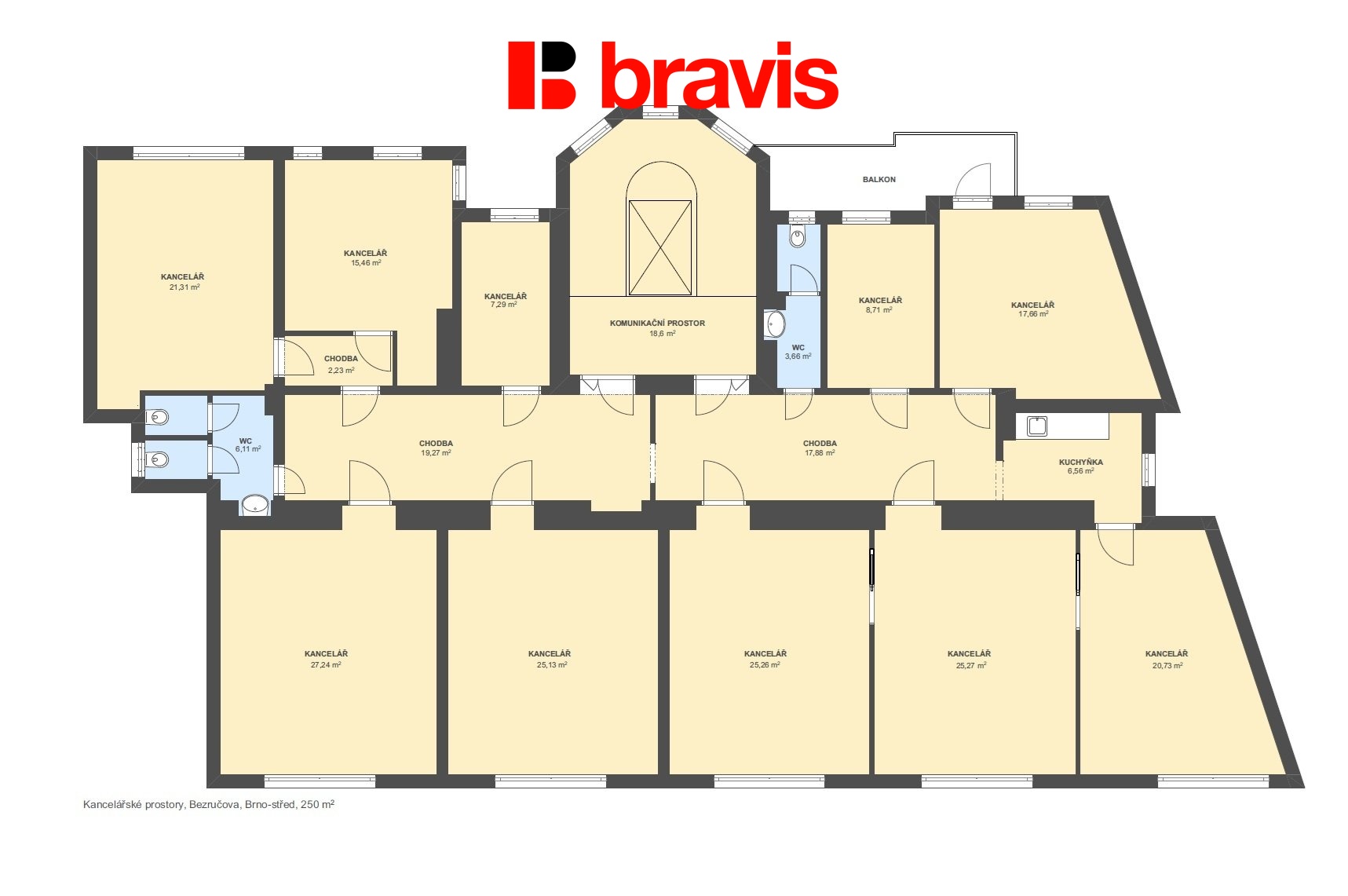 Nezařízené prostory o celkové výměře 250 m2 se nachází ve 3. nadzemním podlaží cihlové budovy. Prostory prošly rekonstrukcí a jsou připraveny k okamžitému nastěhování.