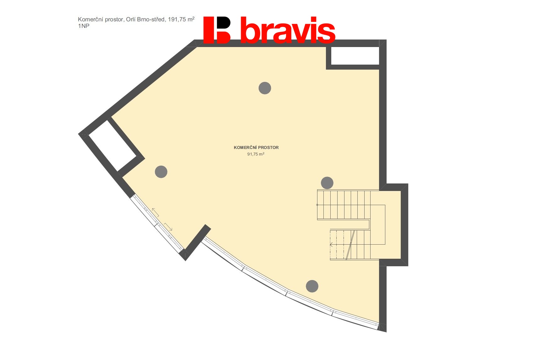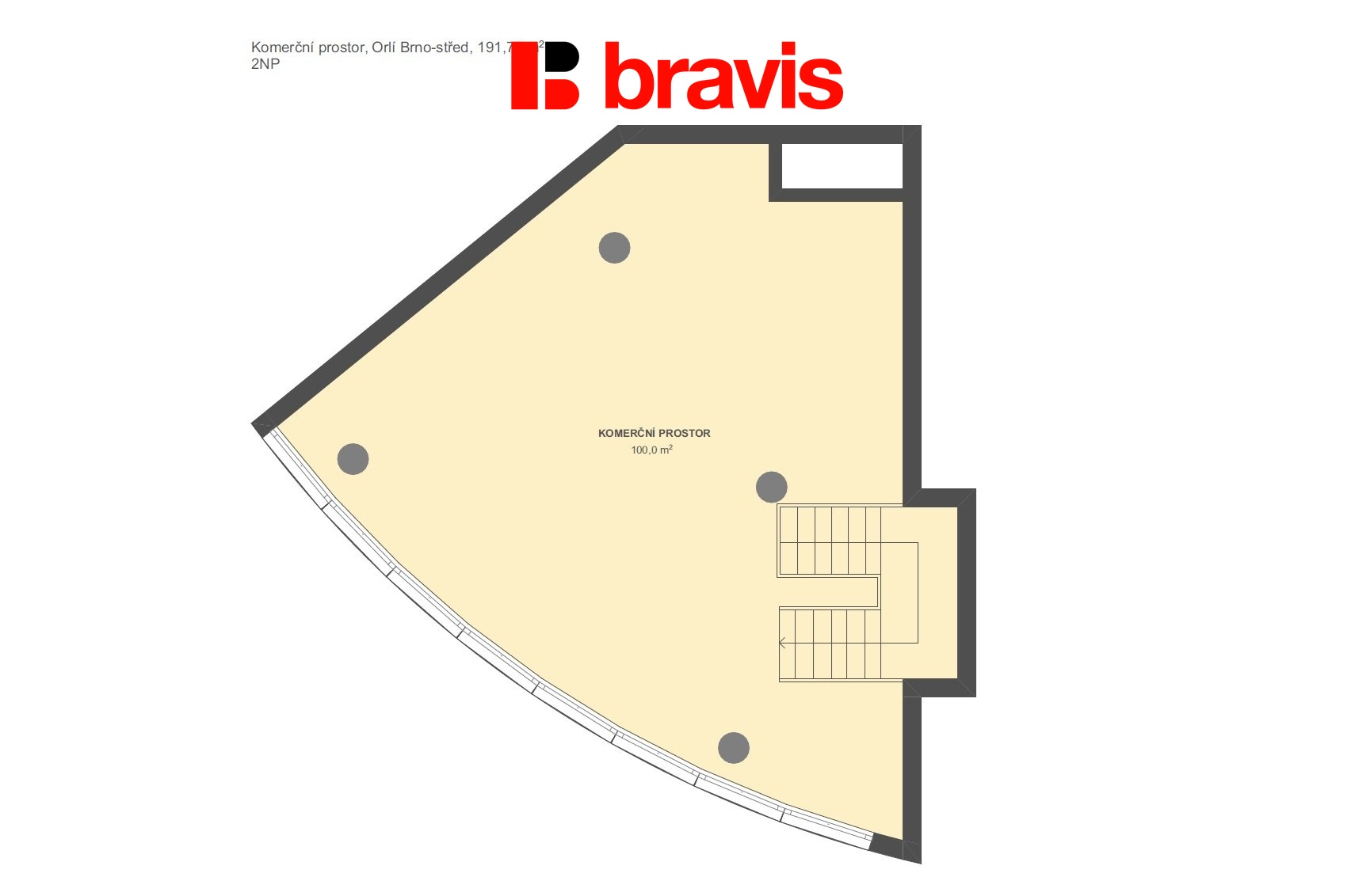 Prostory o celkové výměře 191,75 m² se nachází v 1. NP – 91,75 m² a 2. NP – 100 m² moderní administrativní budovy.