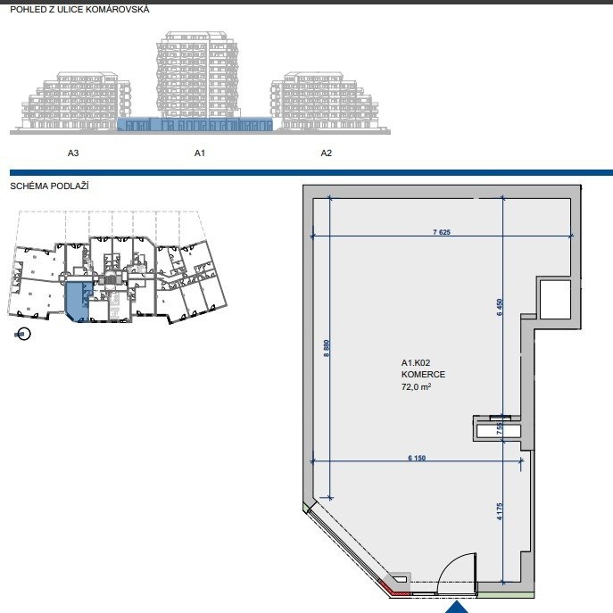 Komerční jednotka o ploše 72 m² se nachází v přízemí novostavby Allrisk MERIDIEM, s přímým vstupem z ulice Komárovská. Díky výkladní části směrem do ulice má prostor výbornou viditelnost a přístupnost pro zákazníky. Otevřený a praktický půdorys umožňuje snadné přizpůsobení různým typům provozů – od obchodu a služeb až po kancelář nebo showroom.