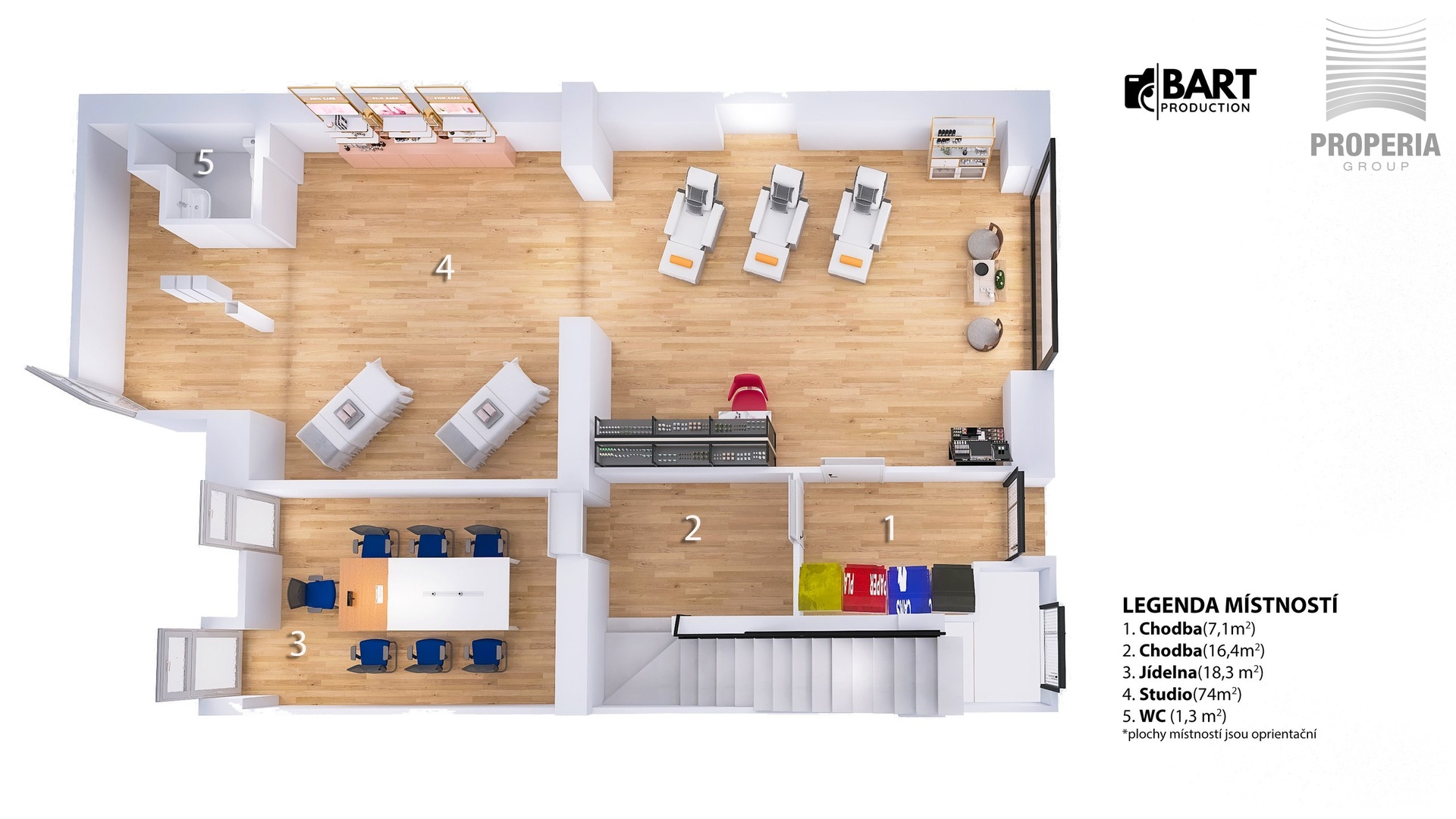 Díky dispozičnímu řešení je možné prostor snadno přizpůsobit konkrétním potřebám – ať už hledáte reprezentativní místo pro klienty, nebo funkční zázemí pro každodenní provoz.