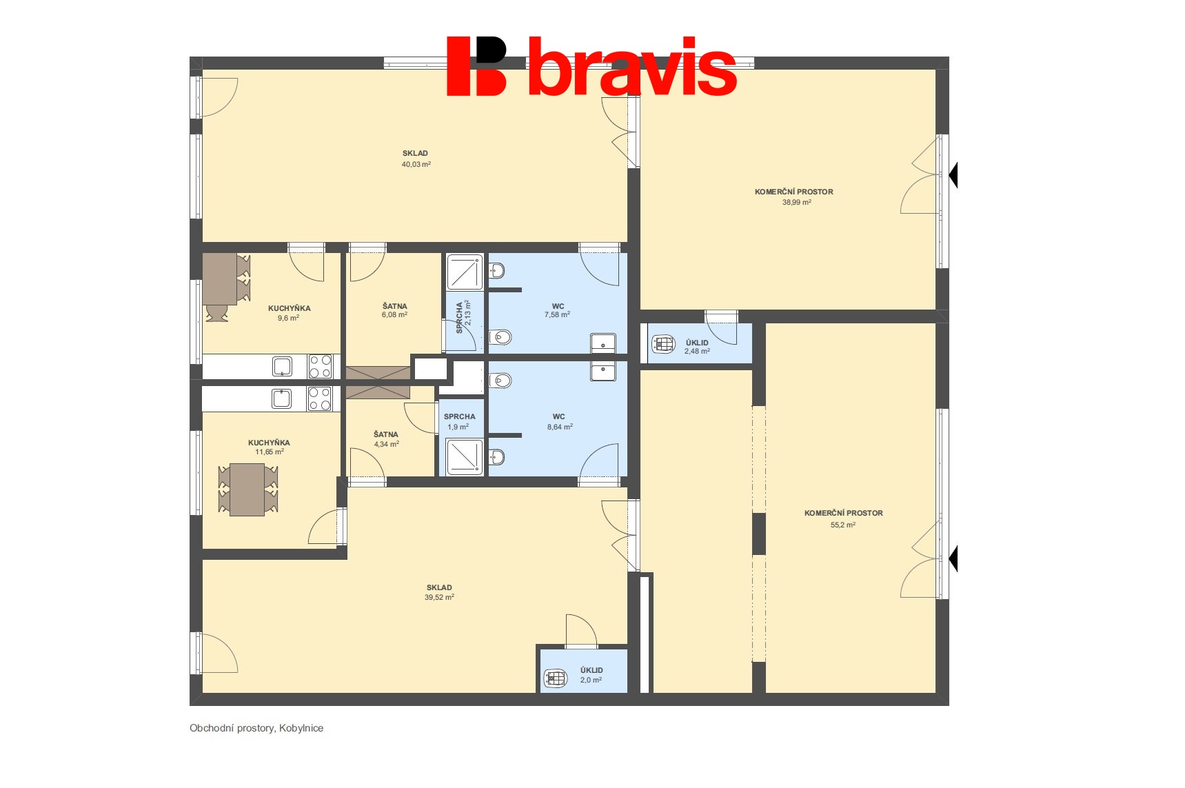 - 2× hlavní komerční prostor (cca 39 m² a 55 m²)