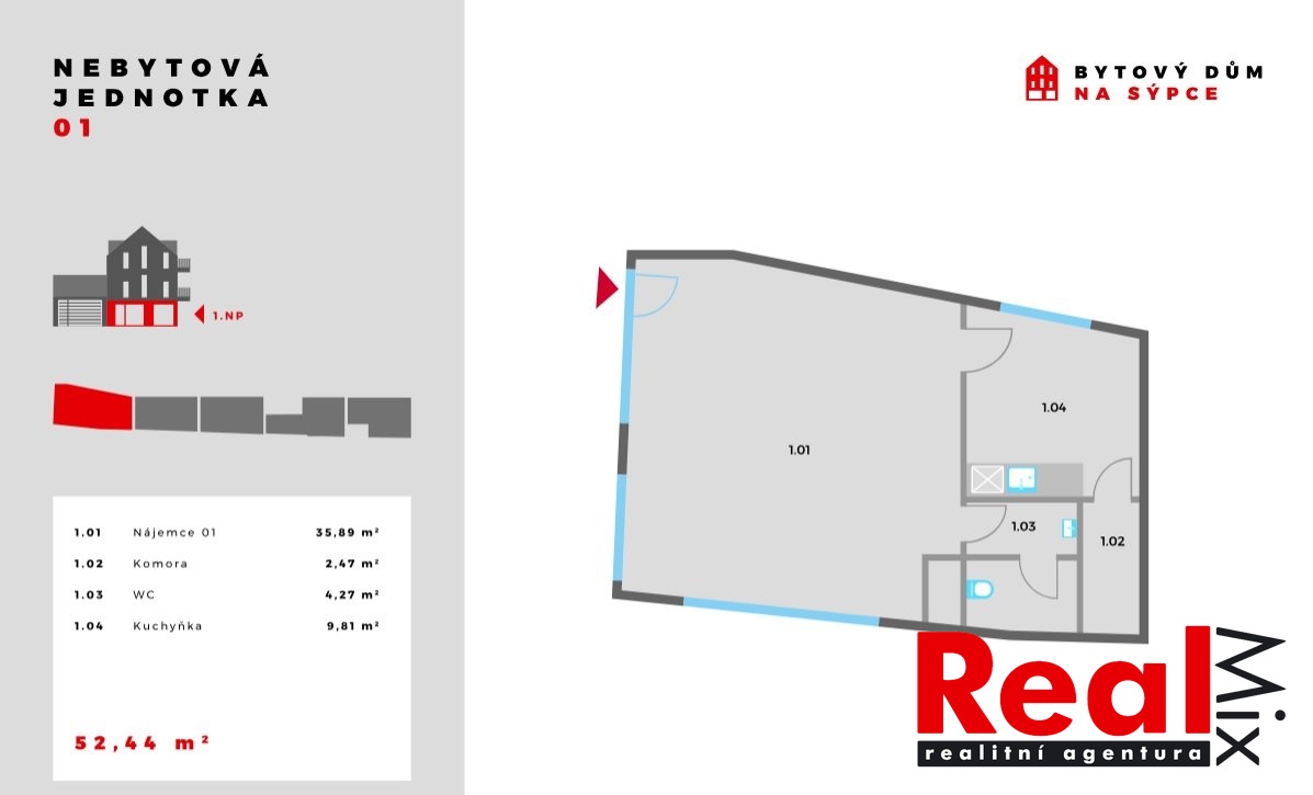 Dispozice: obchodní prostor (kavárna) 36m2, kuchyňka/zázemí 10m2, komora 2,5m2, WC 4m2 Orientace V a J.