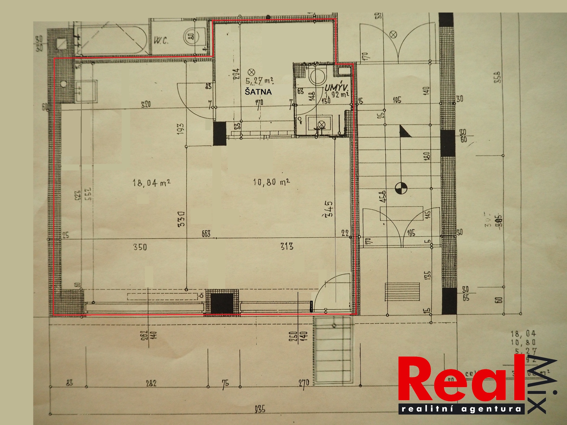 Dispozice: hlavní prostor 29m2, šatna 5m2, WC s umyvadlem 2m2