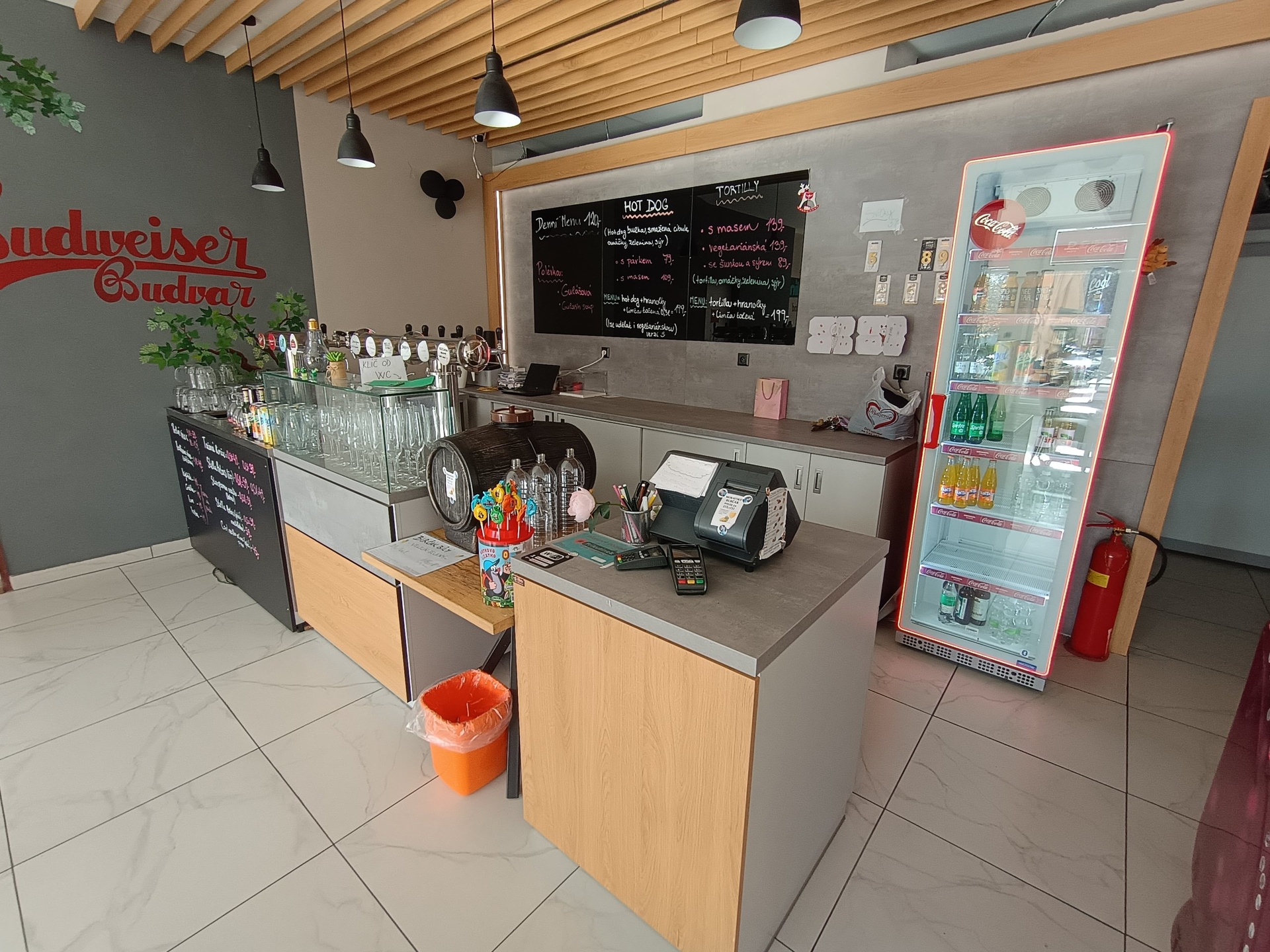 Kompletní interiérové vybavení – barové a výdejní pulty, vitríny, vinotéky, chladicí stoly, stoly a židle pro hosty.