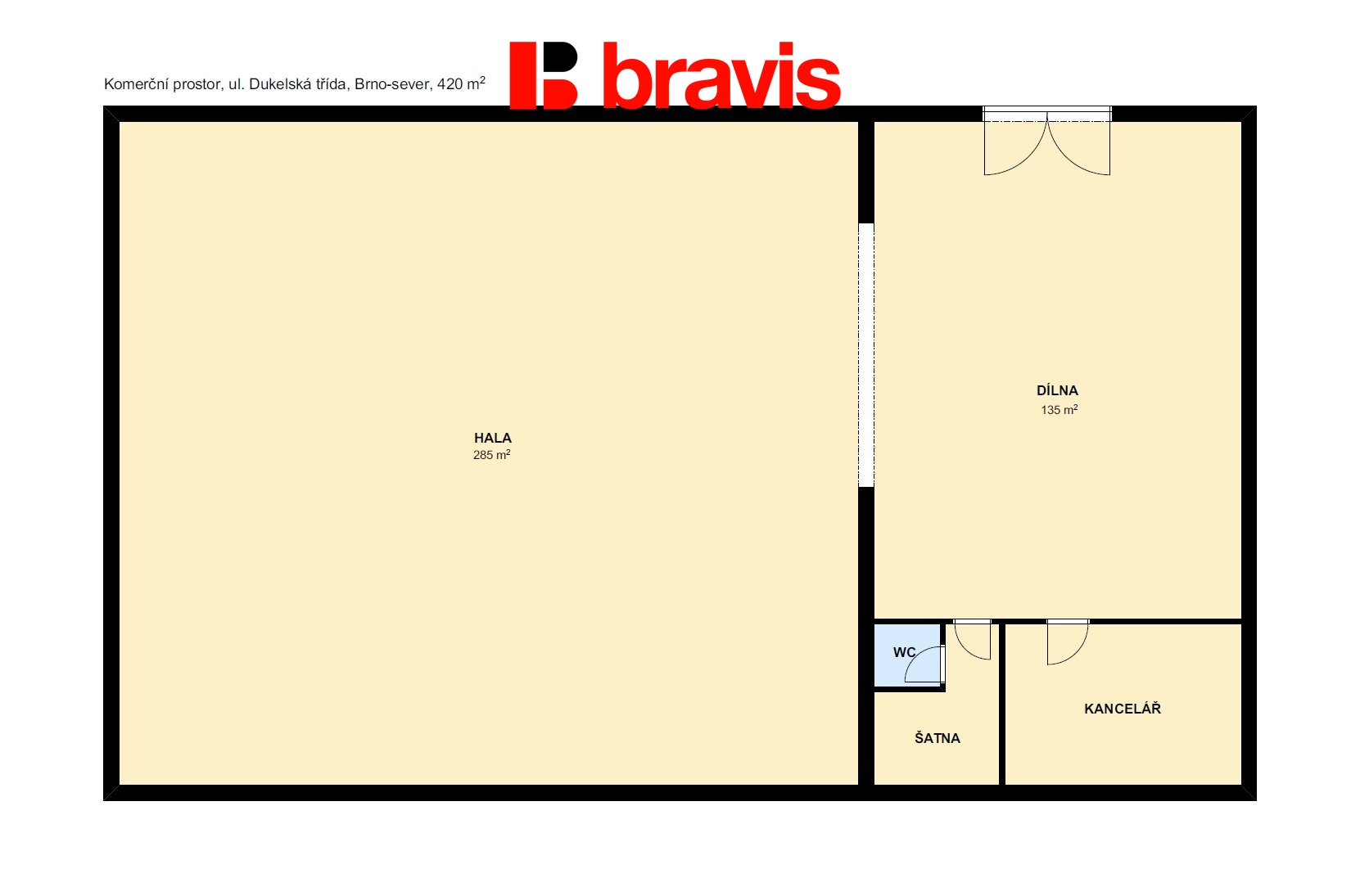 Skládají se ze dvou větších místností ( 285 m2 a 135 m2), dále kancelář a sociální zařízení včetně sprchy.