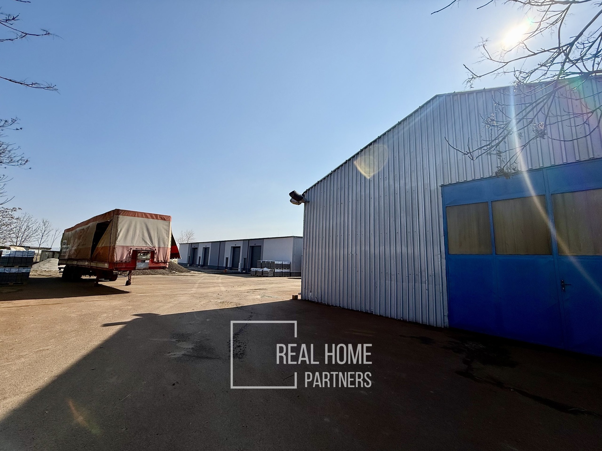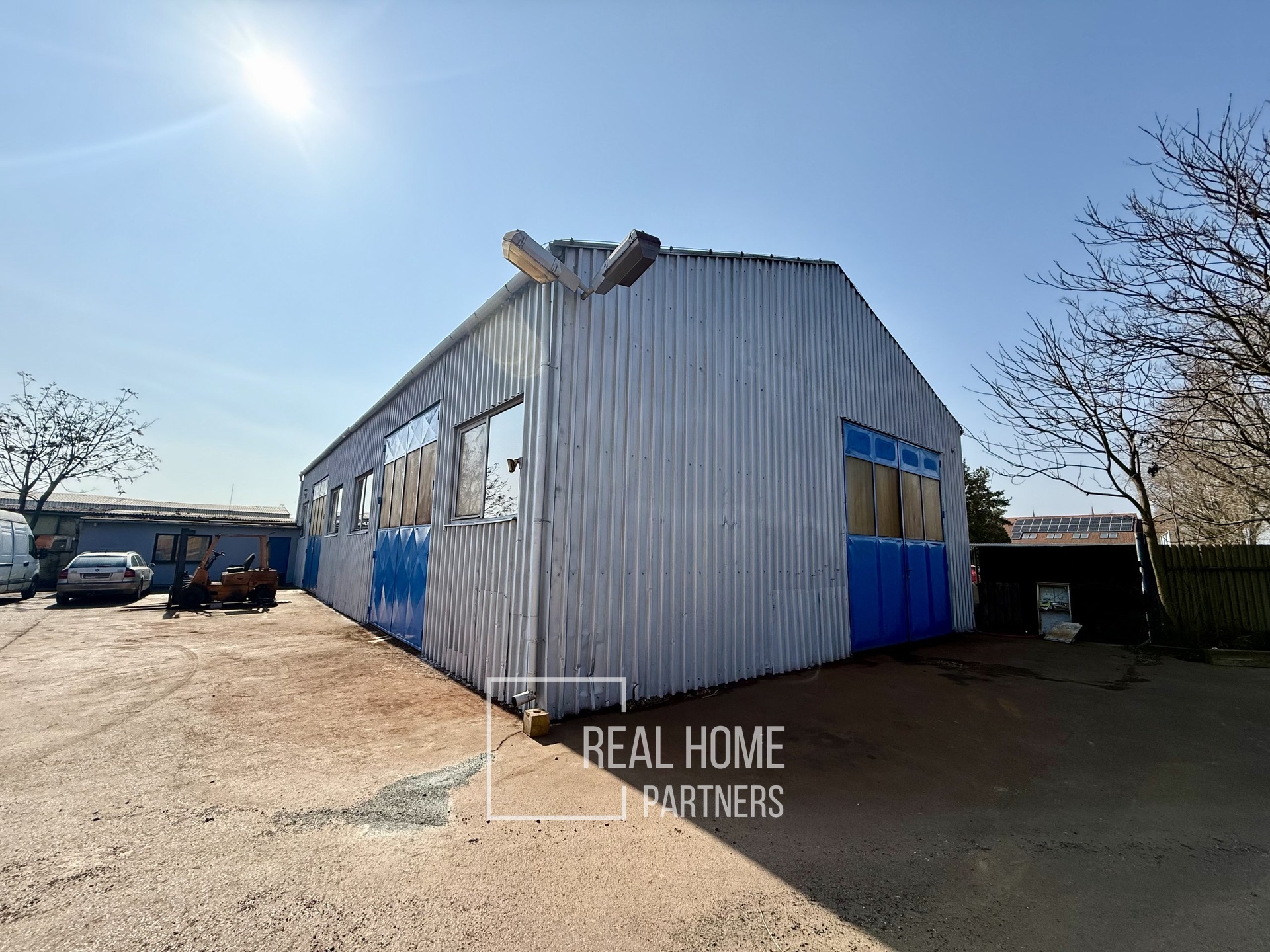 Hala nabízí světlou výšku 5 m, velká vrata (4 × 4 m) a pohodlný přístup pro zásobování i logistiku, včetně kamerového systému.