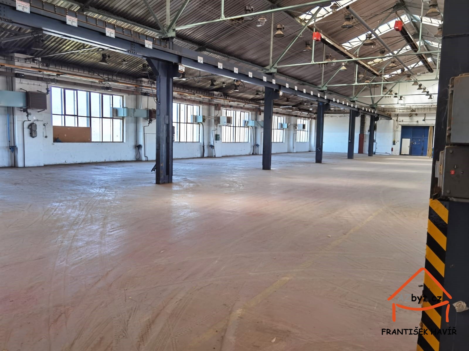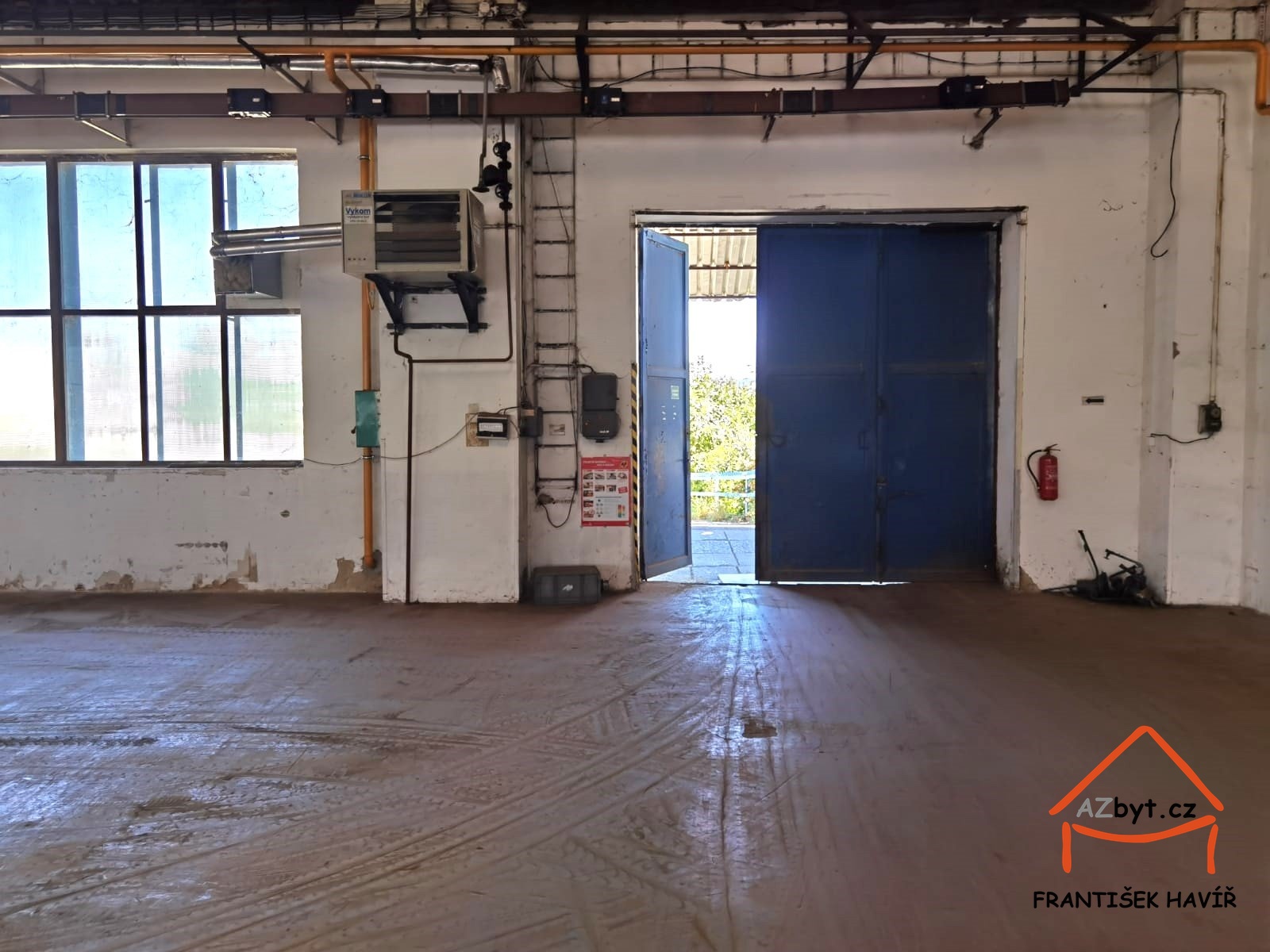 Elektrická energie 230 a 400 V, podlahy betonové, denní světlo, výška 5 m, vrata 4,5 x 5 m.