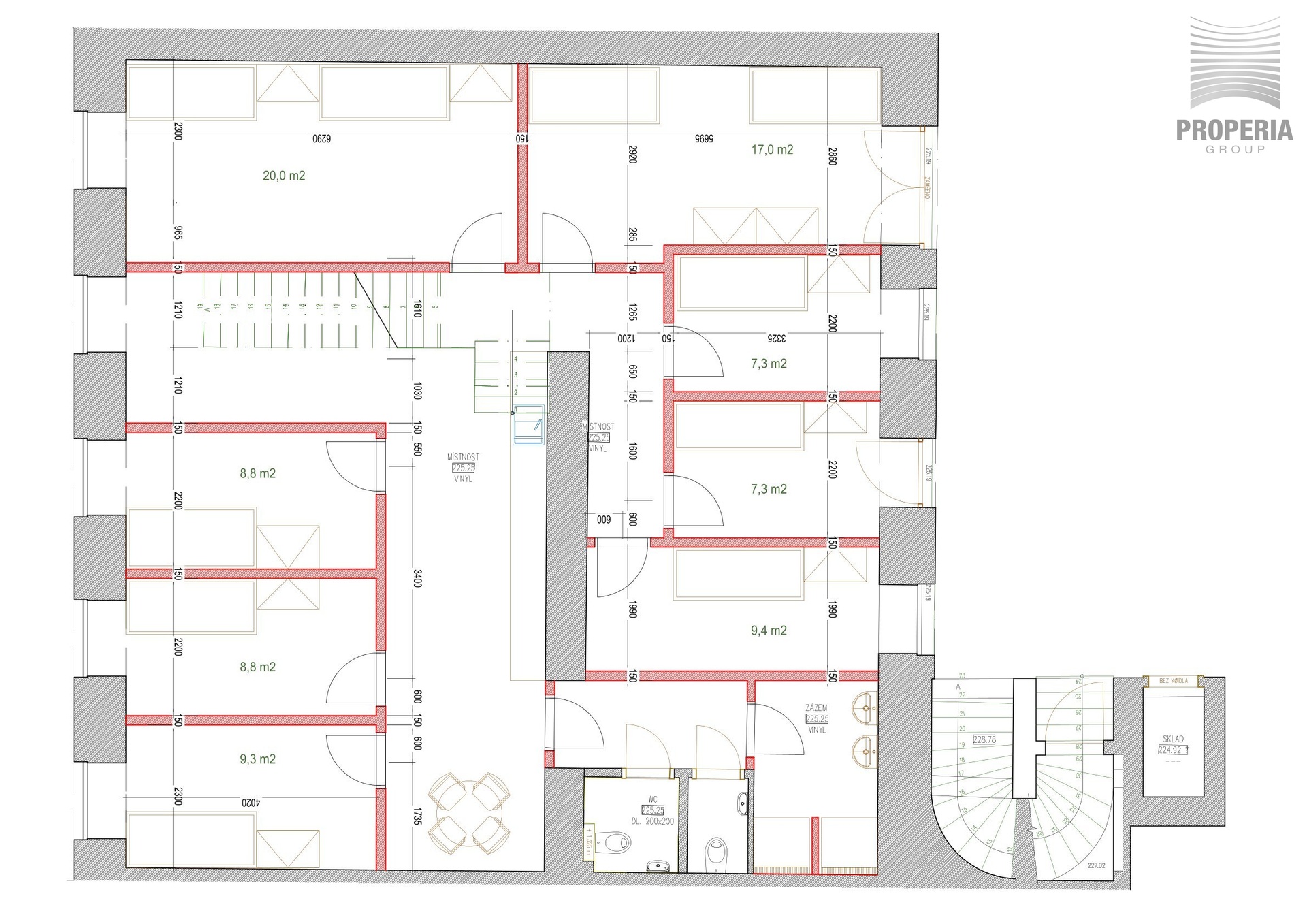 Ve druhém nadzemním podlaží se nachází 9 pokojů a sociálním zařízením.