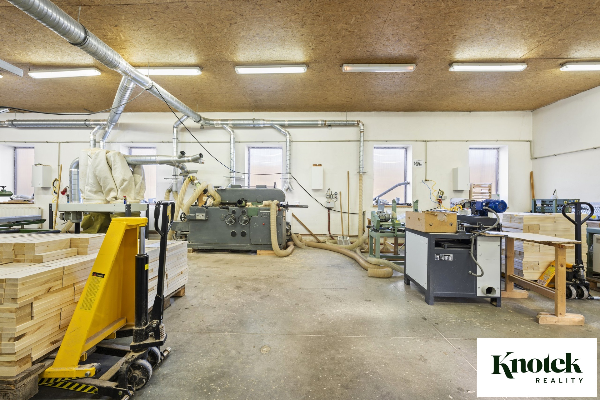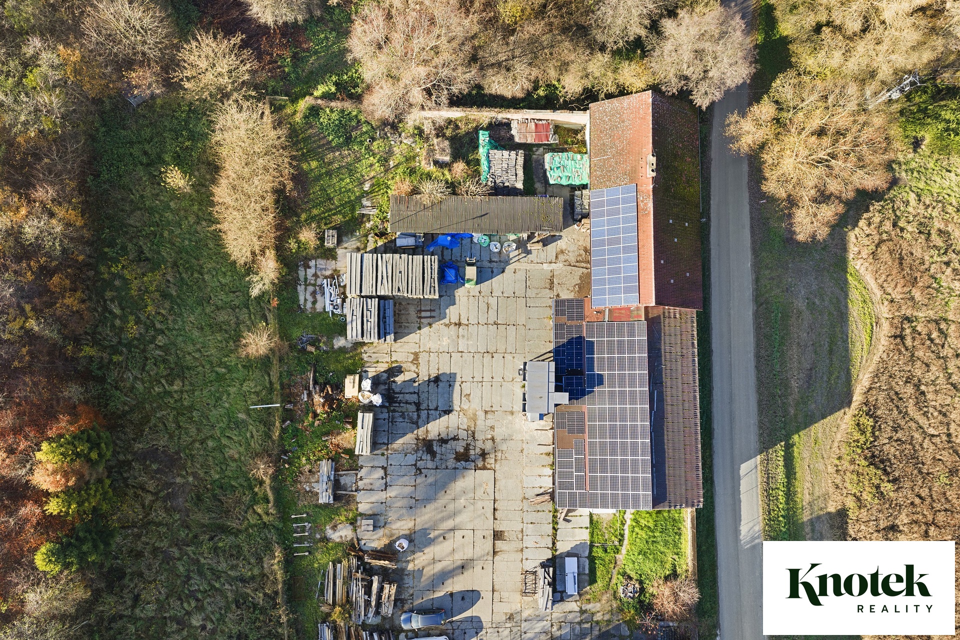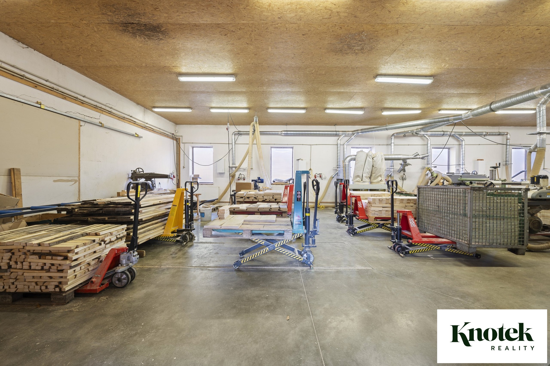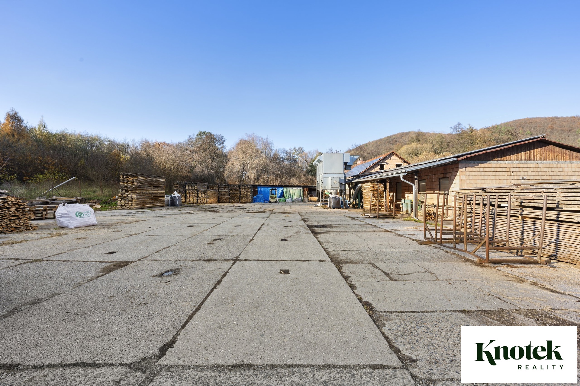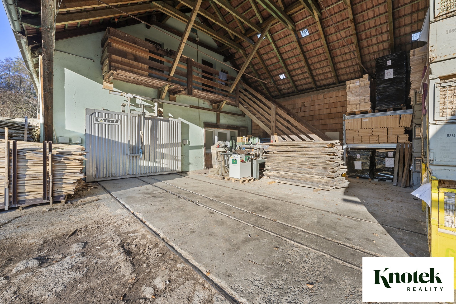 Výměry: garáž 40,76 m2, sklad 1: 19,28 m2, sklad 2: 22,22 m2, klimatizovaný sklad 3: 12,13 m2, sušárna dřeva 37,69 m2, venkovní polootevřený sklad 99,85 m2.