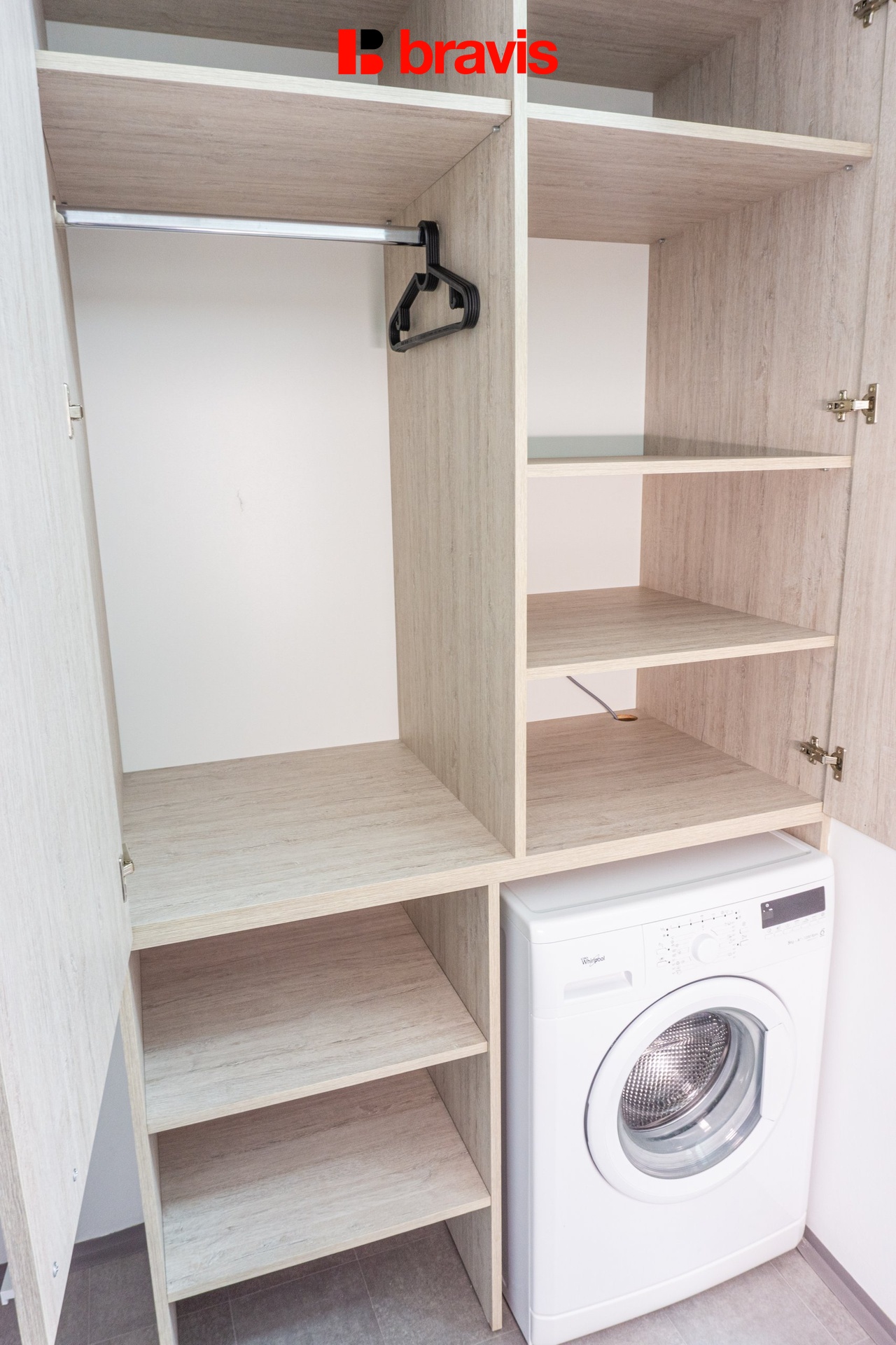 Vestavěná šatní skříň, věšáková stěna, pračka, sušák na prádlo. Každý byt je také vybaven lůžkoviny.