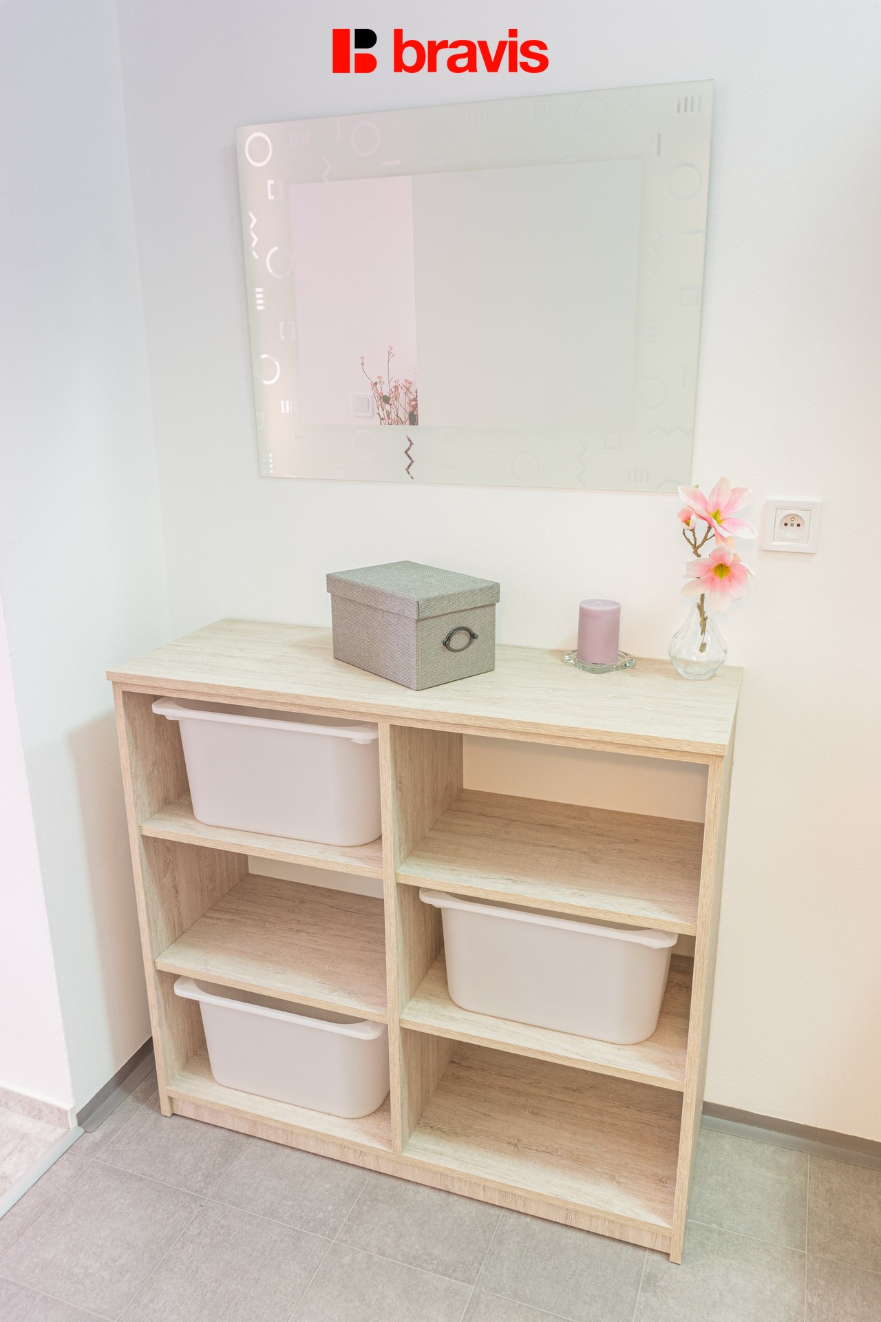 WC, umyvadlo, zrcadlo, police, sprchový kout, topný žebřík.