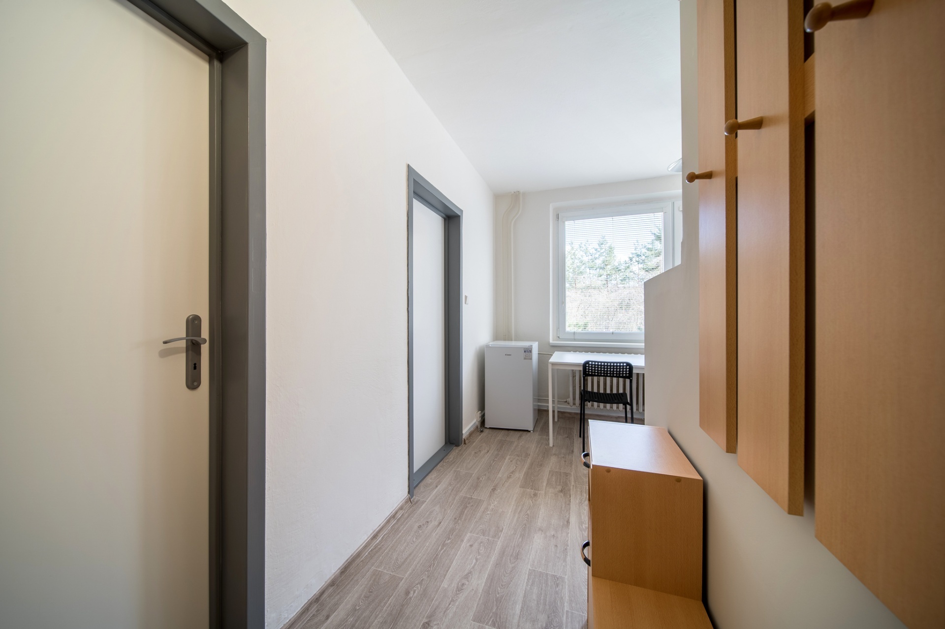 vstupní předsíň, sádrokartonové jádro (koupelna se sprchovým, umyvadlem a WC), kuchyň (PVC), pokoj (parkety a koberec) s výstupem na lodžii, sklepní box umístěný v přízemí domu. Dům je zateplen, má novou fasádu a plastová okna. Volné ihned. Průkaz energetické náročnosti budovy: třída C.