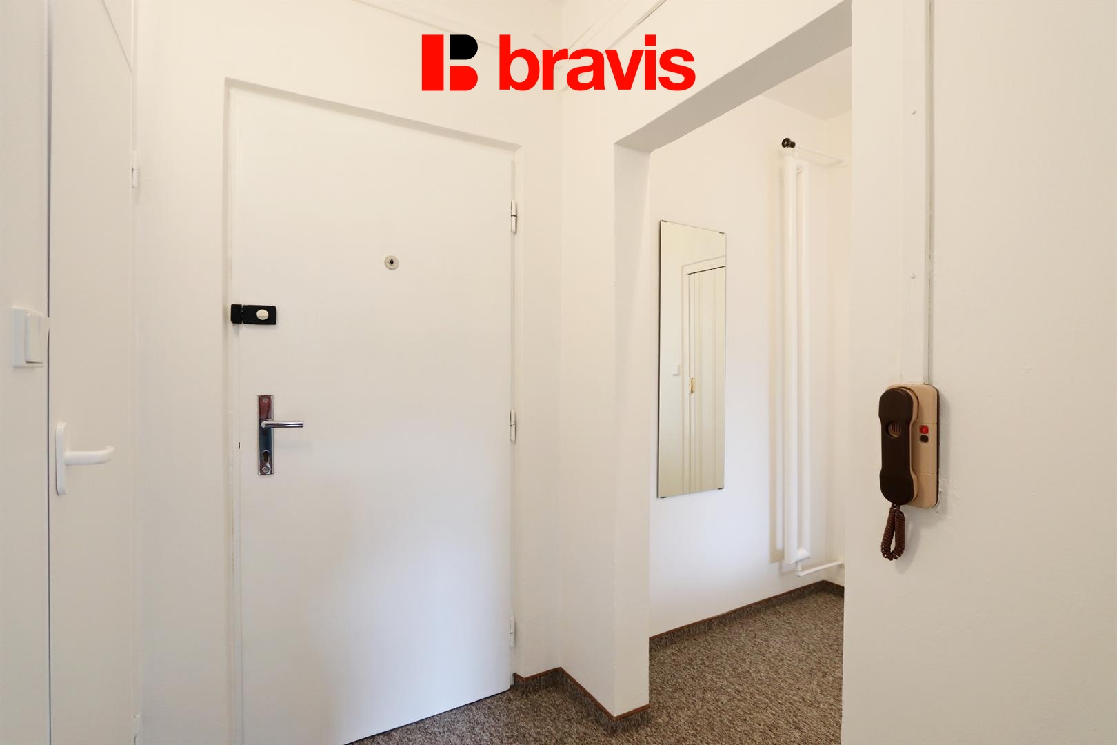 V předsíni je vestavěná skříň s policemi, zrcadlo a intercom.
