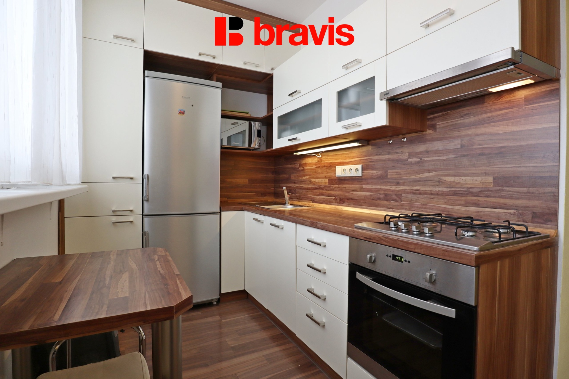 Kuchyně je vybavena linkou na míru včetně spotřebičů - lednicí, mrazákem, myčkou, el.troubou, plynovým sporákem, digestoří a mikrovlnnou troubou.
