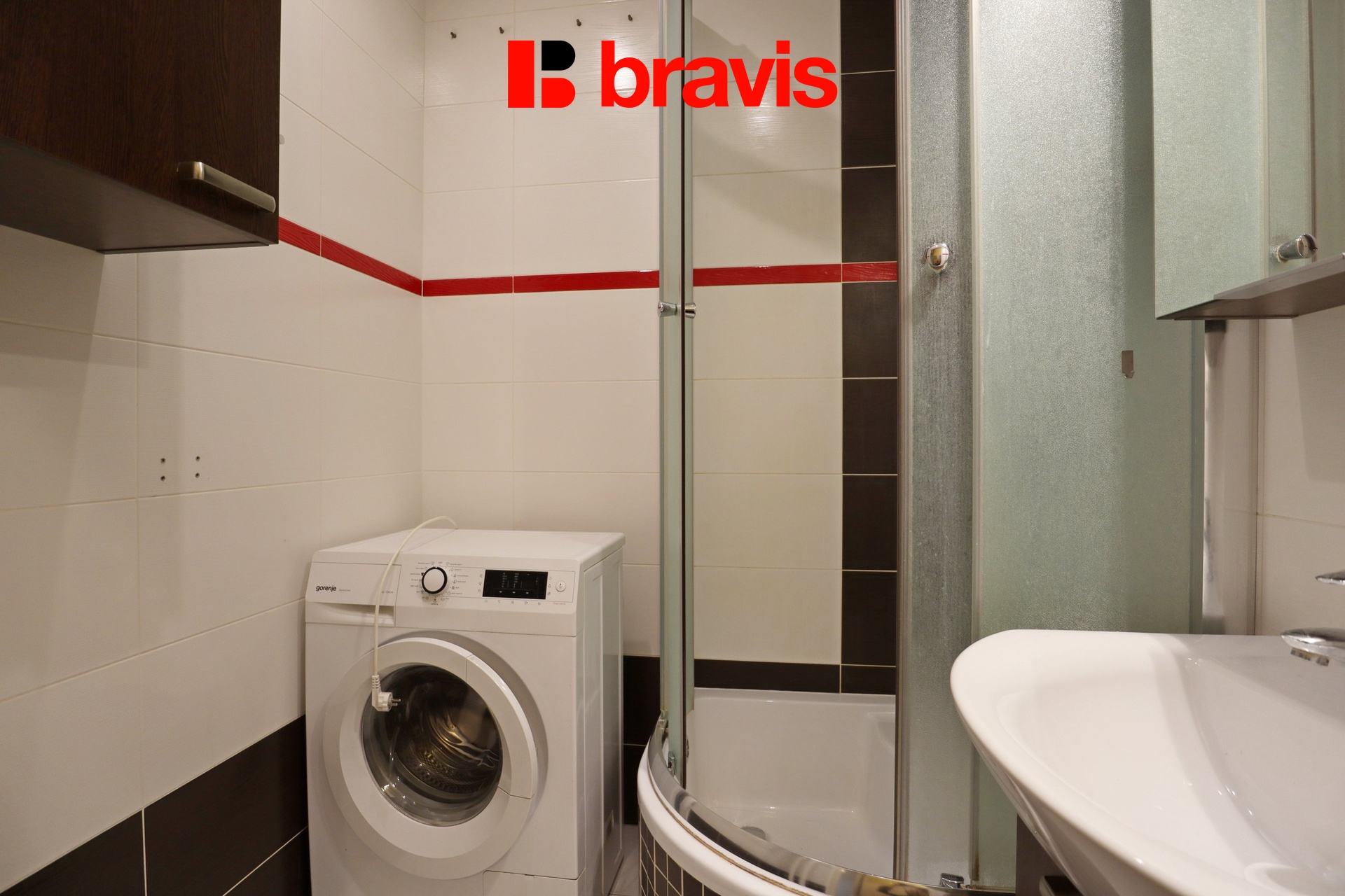 V koupelně je sprchový kout, umyvadlo se skříňkou, otopný žebřík a pračka.