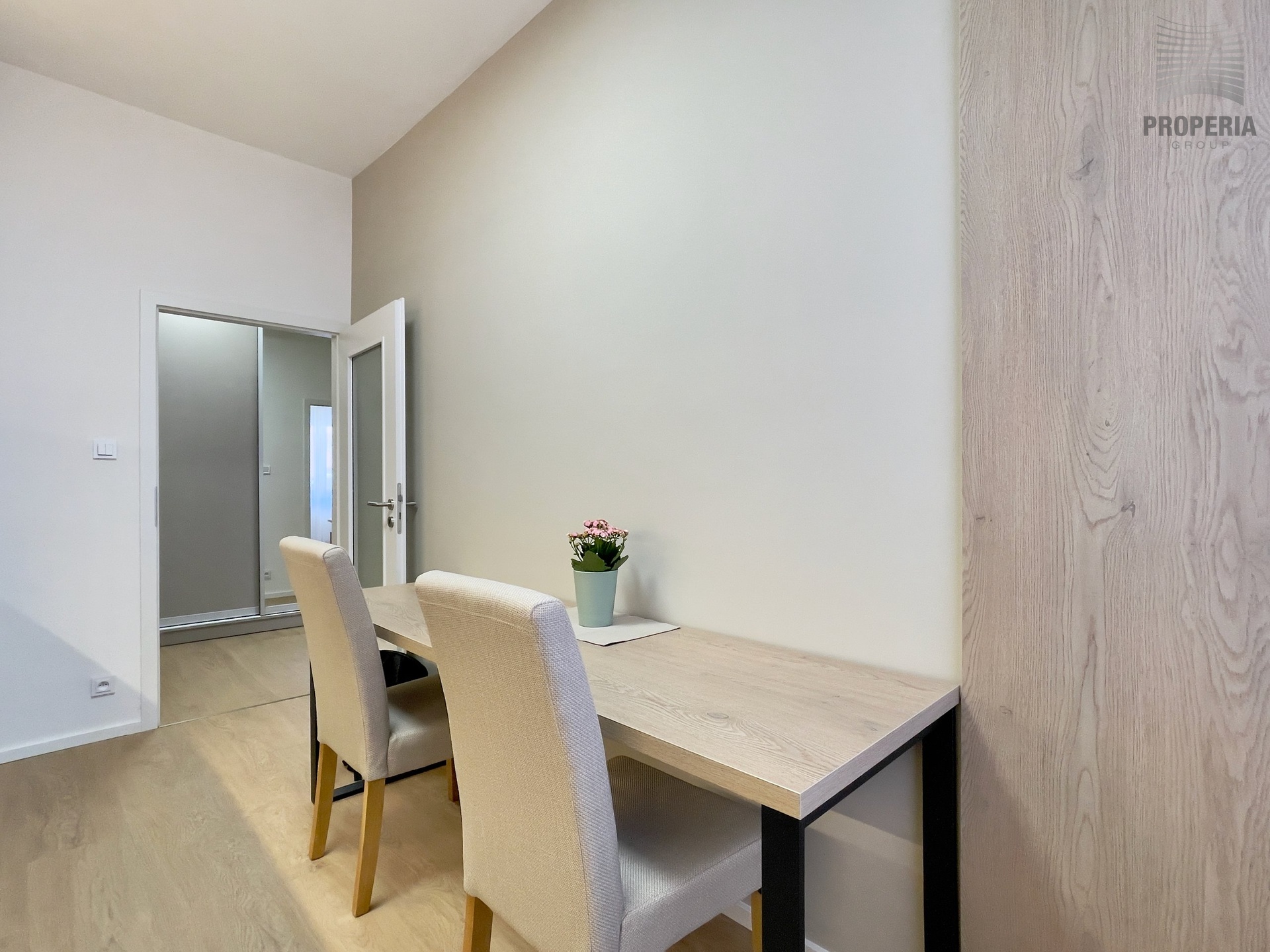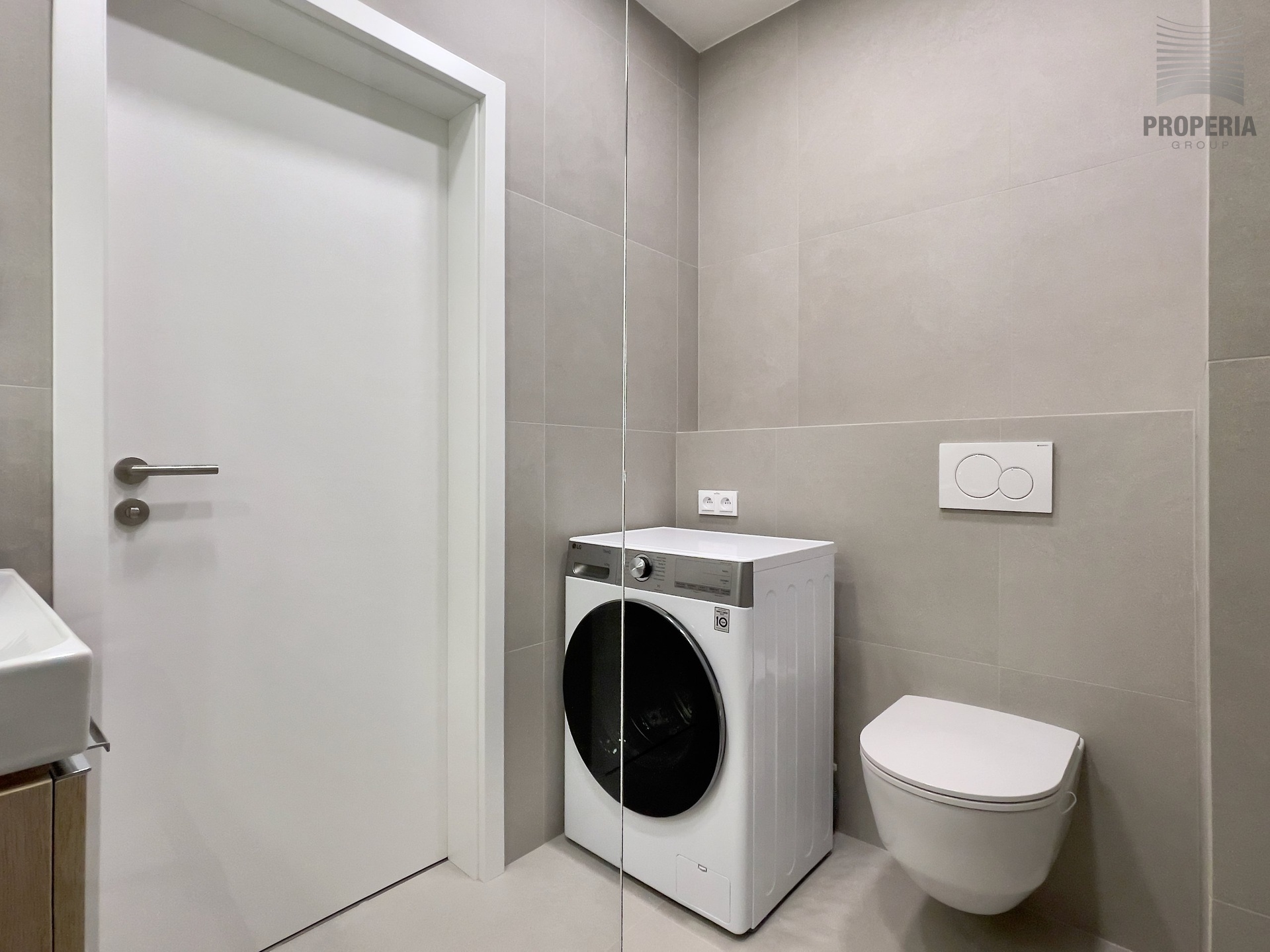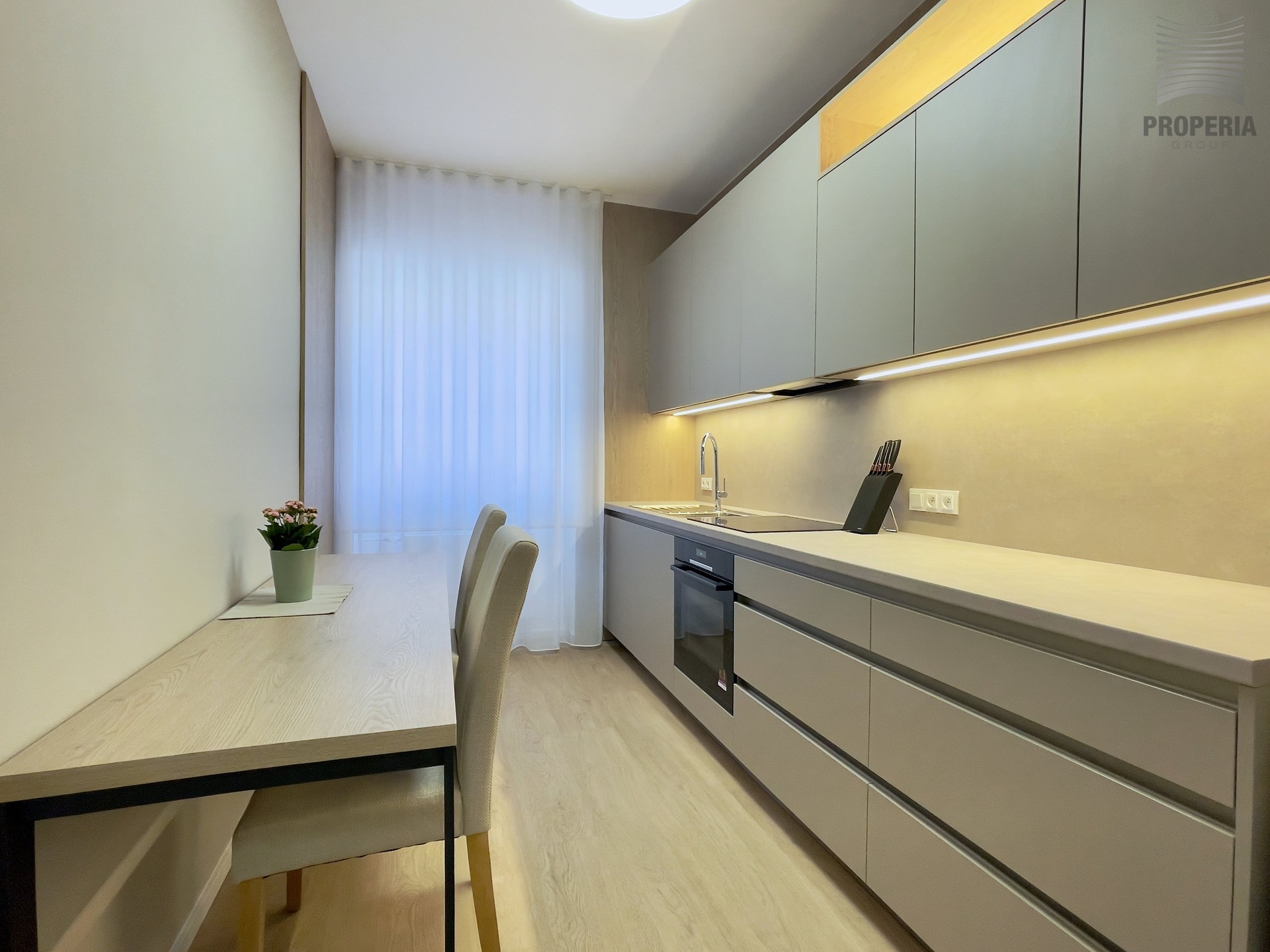 Interiér byl navržen s důrazem na kvalitu, funkčnost a čistý moderní styl. Součástí pronájmu je kompletní vybavení, které výrazně zvyšuje komfort každodenního bydlení. Kuchyňská linka se spotřebiči (trouba, elektrická varná deska, digestoř, myčka, lednice, kávovar, rychlovarná konvice) i vybavením (nádobí a příbory). Dále pračka se sušičkou, nechybí ani televize, připojení k internetu, postel a prostorné vestavěné skříně na chodbě i v ložnici. Samozřejmostí jsou okenní rolety.