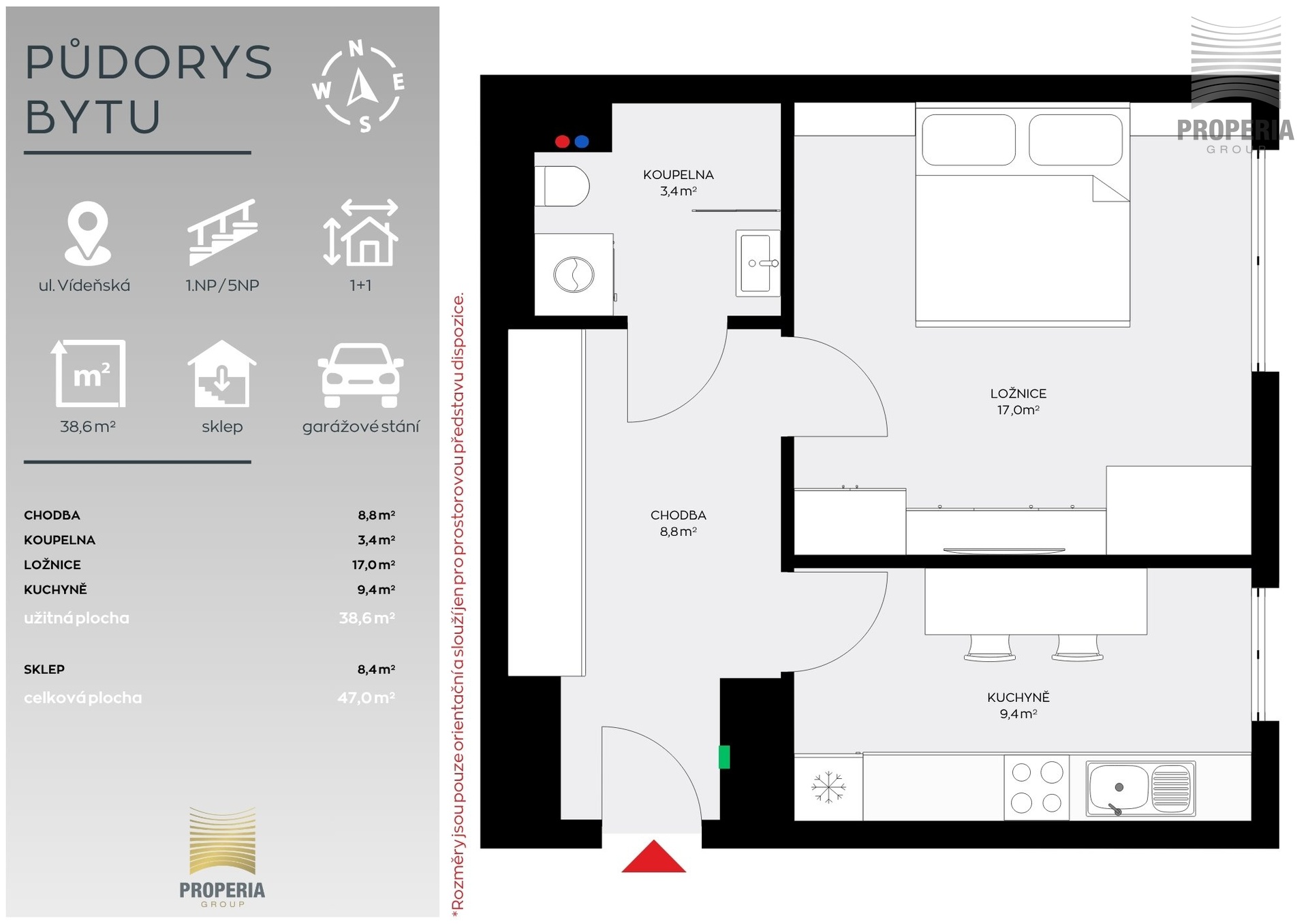 Pronájem nově zrekonstruovaného bytu 1+1 se sklepem a garážovým stáním.