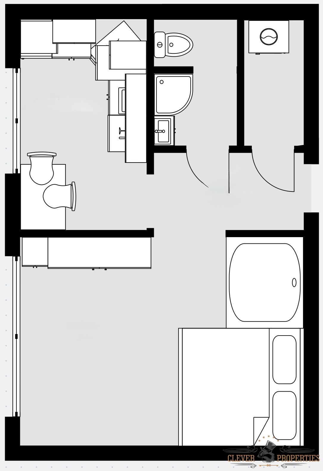 Byt samotný je vybaven kuchyňskou linkou, sklokeramickým sporákem s troubou, lednicí s mrazákem a myčkou. V kuchyni je i dostatek prostoru na stůl se židlemi. Obývací pokoj je vybavení jednoduchým nábytkem, držákem na televizor a skeletem na dvoulůžkovou postel.