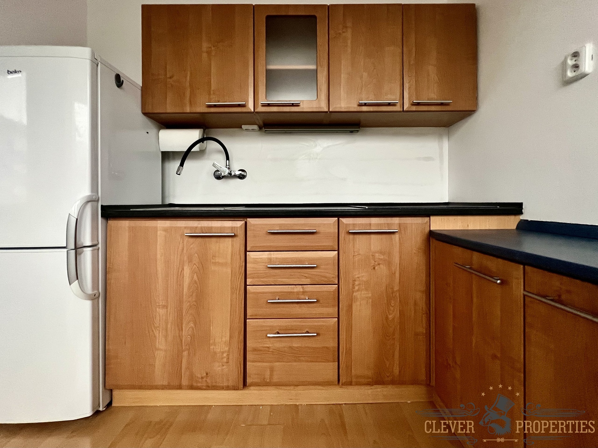 Kuchyň je vybavena novou kuchyňskou linkou se sklokeramickou varnou deskou, lednicí s mrazničkou, vyklápěcím jídelním stolem a židlemi. V bytě jsou nové podlahy, dveře, plastová okna se žaluziemi.