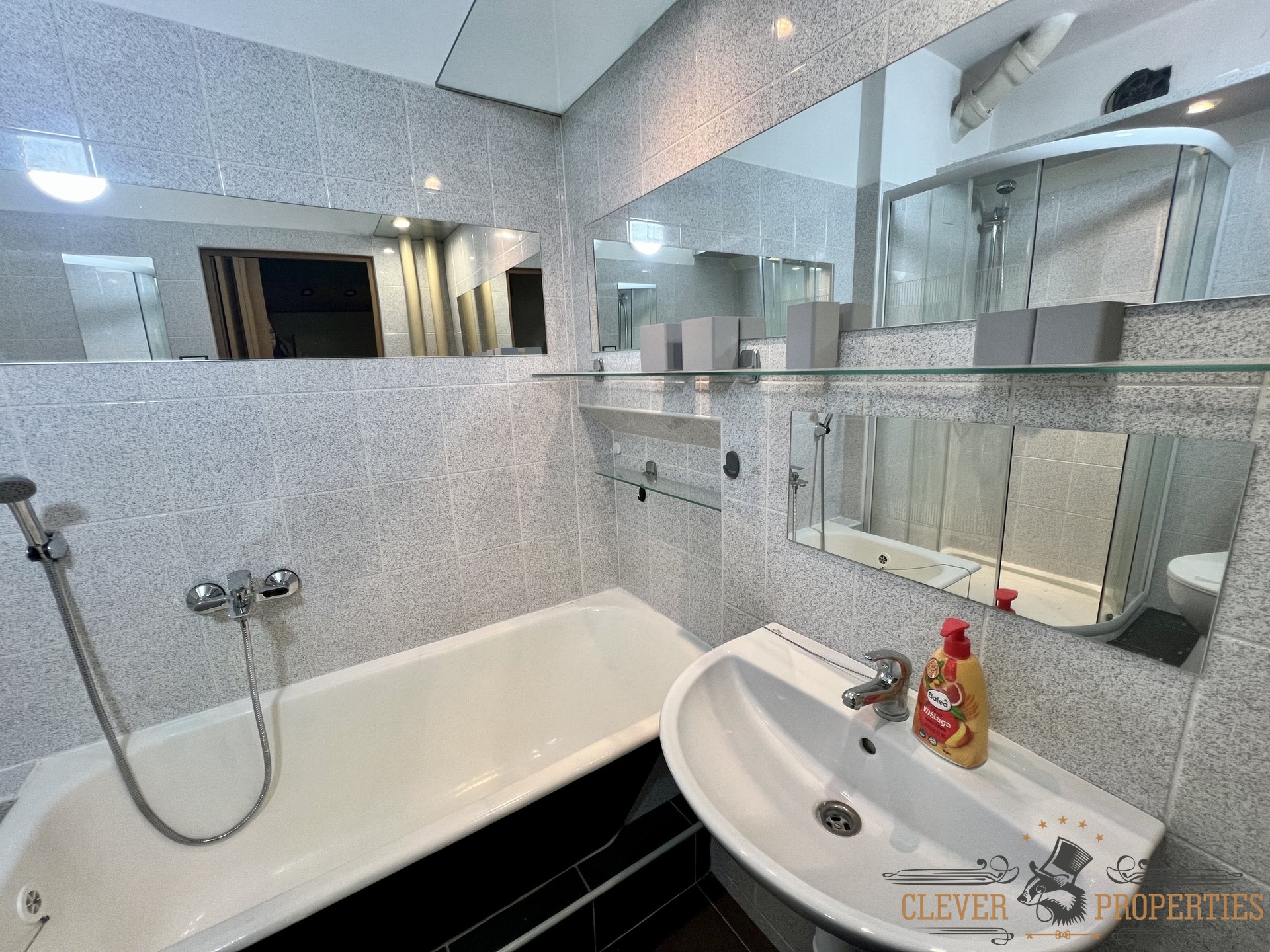K dispozici je nová koupelna se sprchovým koutem, vanou, WC, kvalitními vodovodními bateriemi a přípojkou na pračku.