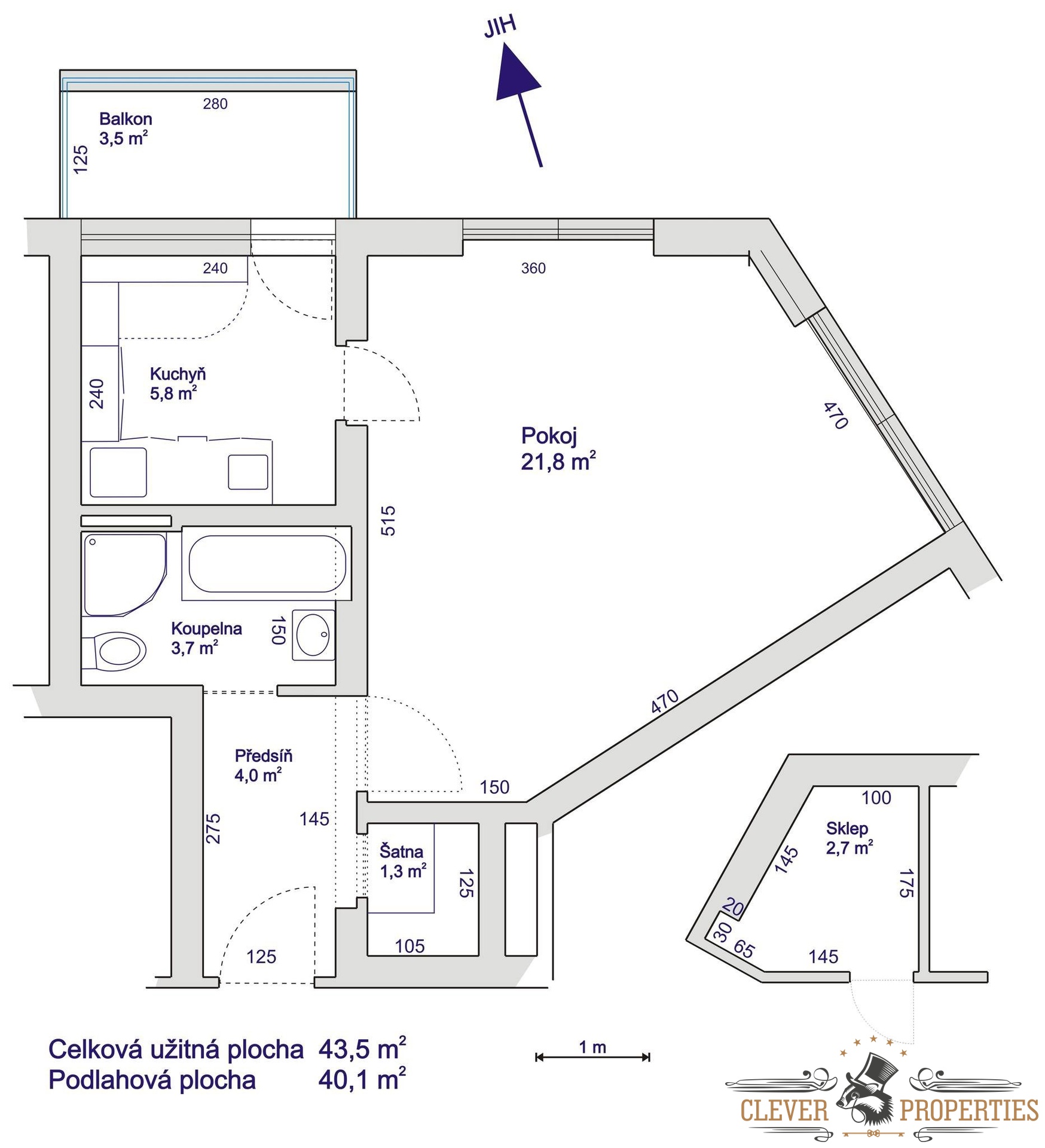 Byt má nadstandardní užitnou plochu 43,5 m², která odpovídá spíše běžným bytům 2+1. Díky velkorysému dispozičnímu řešení nabízí obývací pokoj dostatek místa pro plnohodnotný obývací pokoj a zároveň ložnici.
