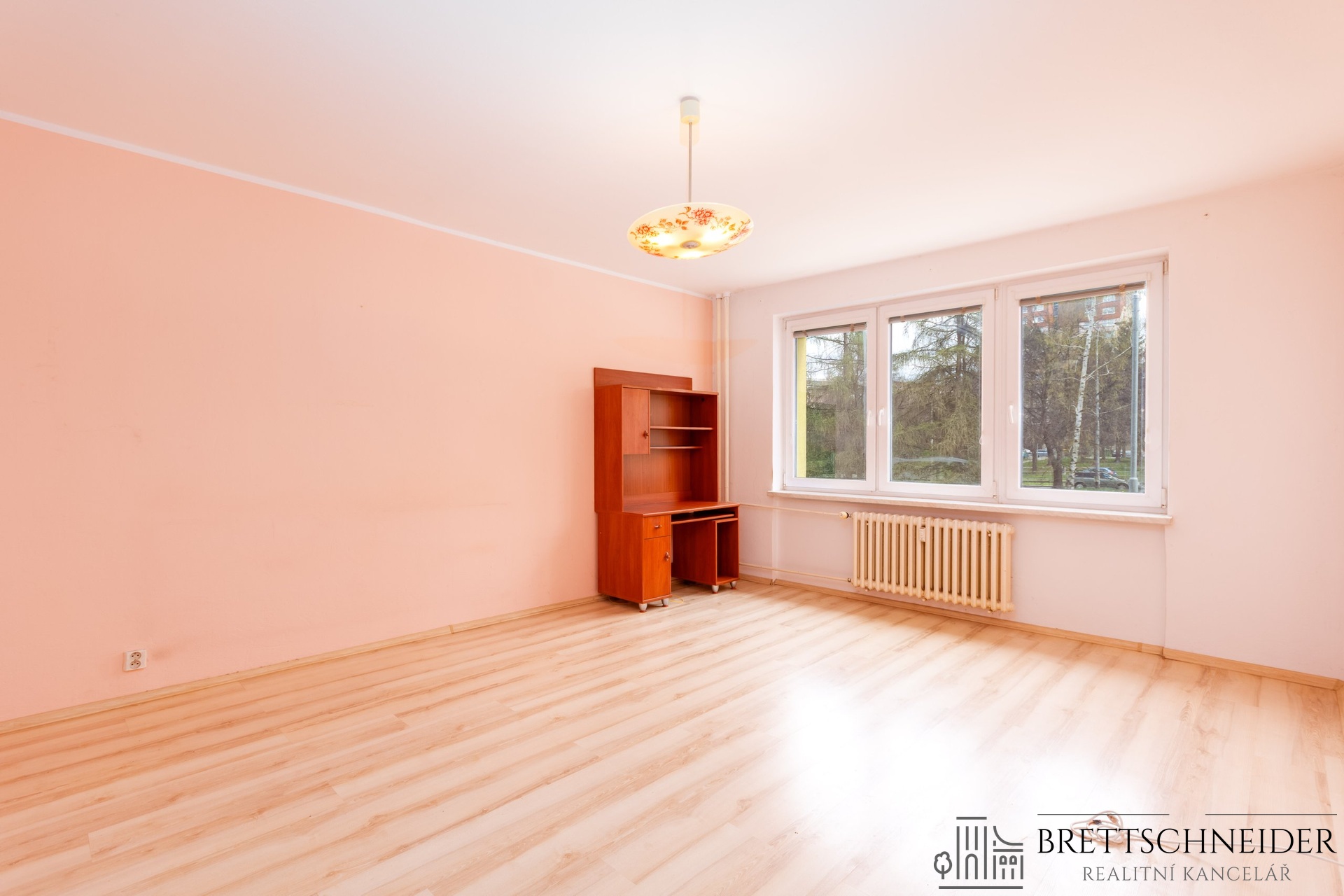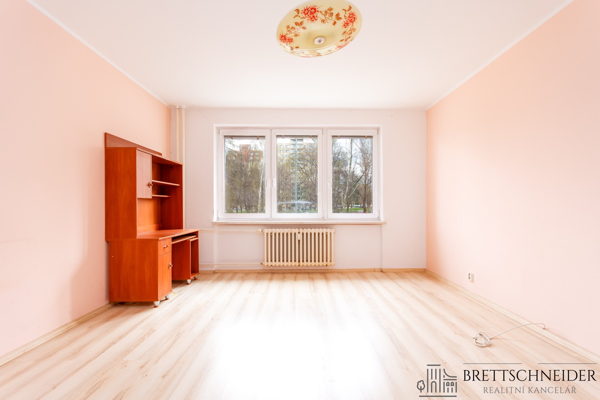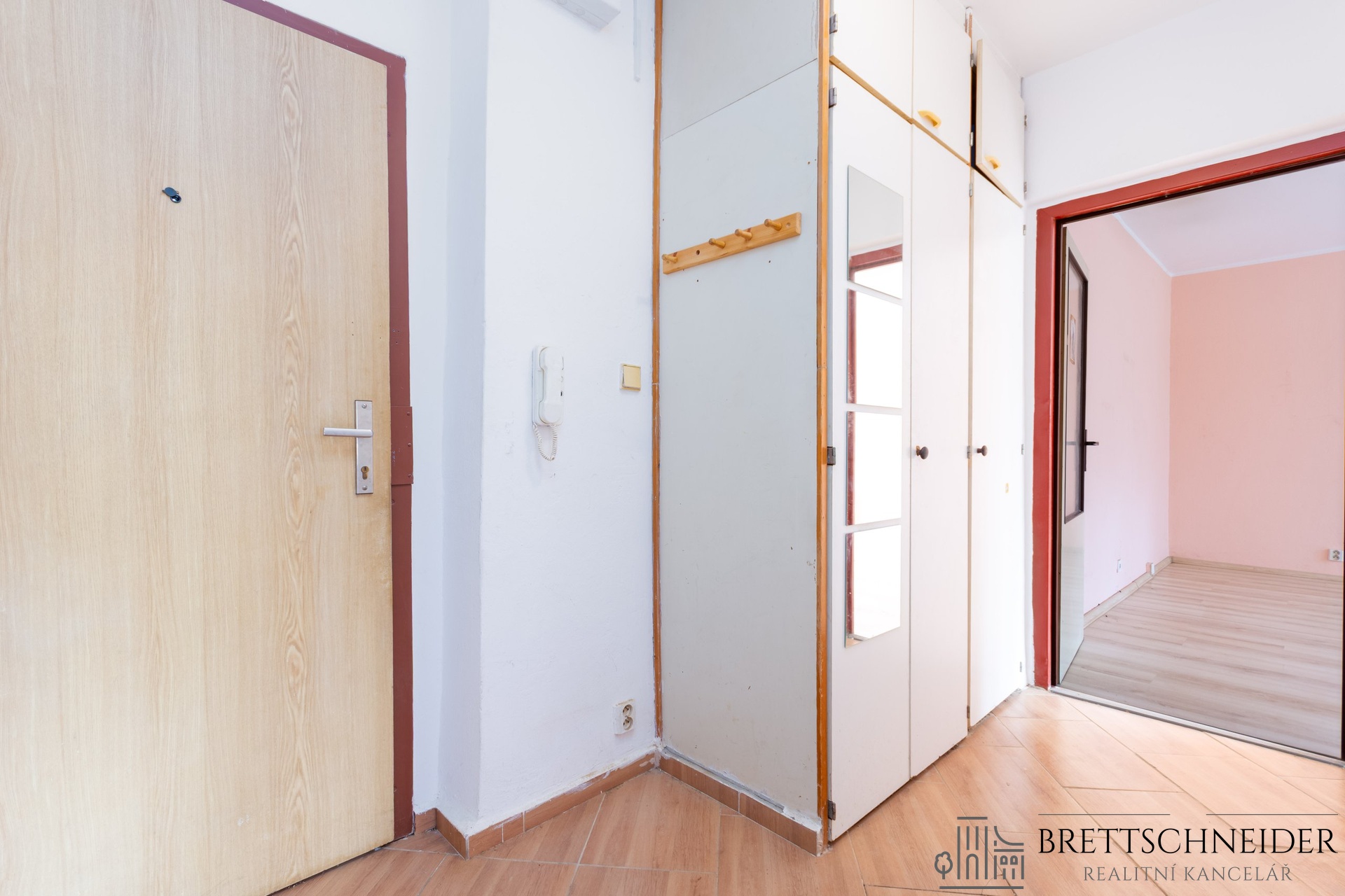 Interiér bytu je částečně vybaven – nechybí prostorná vestavěná skříň, která zajišťuje dostatek úložného prostoru.