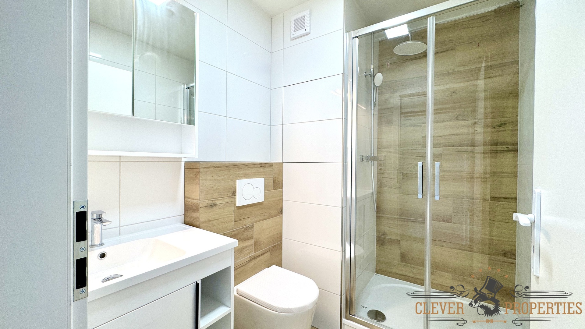 Koupelna byla vybudována zcela nově, je společná s toaletou a její dominantou je prostorný sprchový kout. Místo pro pračkou nebo sušičku je velice prakticky připraveno v úložném prostoru mimo koupelnu.