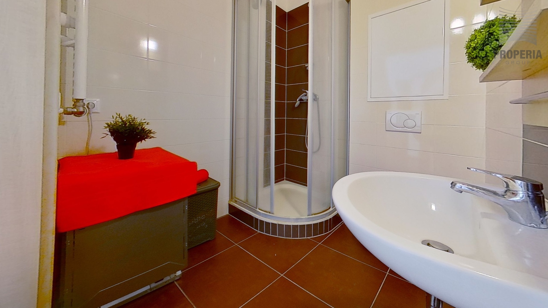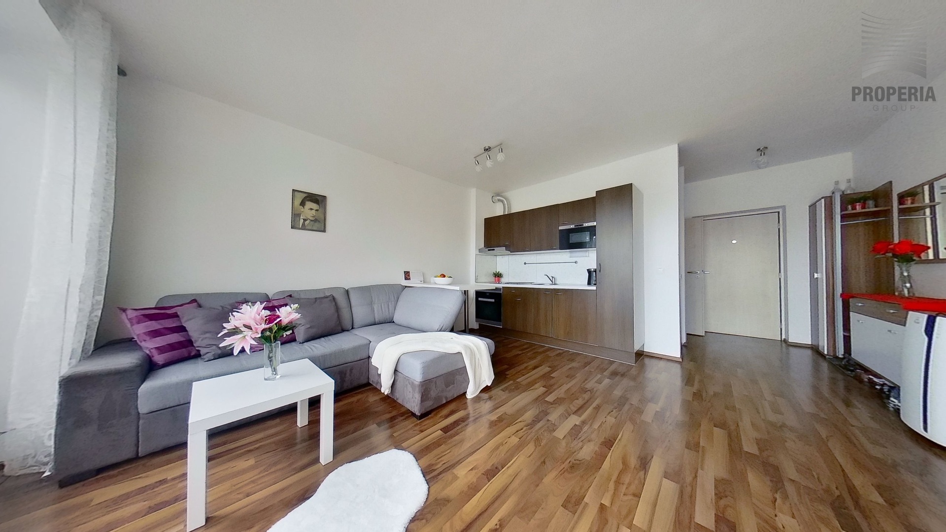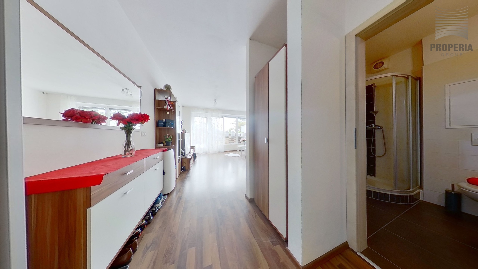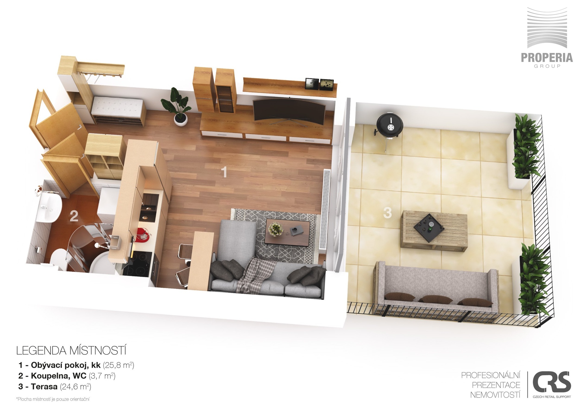 Byt nabízí obývací pokoj s kuchyňským koutem o velikosti 25,8 m², kde najdete praktickou kuchyňskou linku s moderními spotřebiči, dostatek úložných prostor, pohodlnou sedací soupravu a obývací stěnu. Koupelna s WC o velikosti 3,7 m² je vybavena sprchovým koutem, toaletou a umyvadlem v moderním designu. Skutečným lákadlem je terasa o ploše 24,6 m², která poslouží jako druhý obývák na čerstvém vzduchu – perfektní místo na relax, grilování s přáteli nebo ranní kávu.