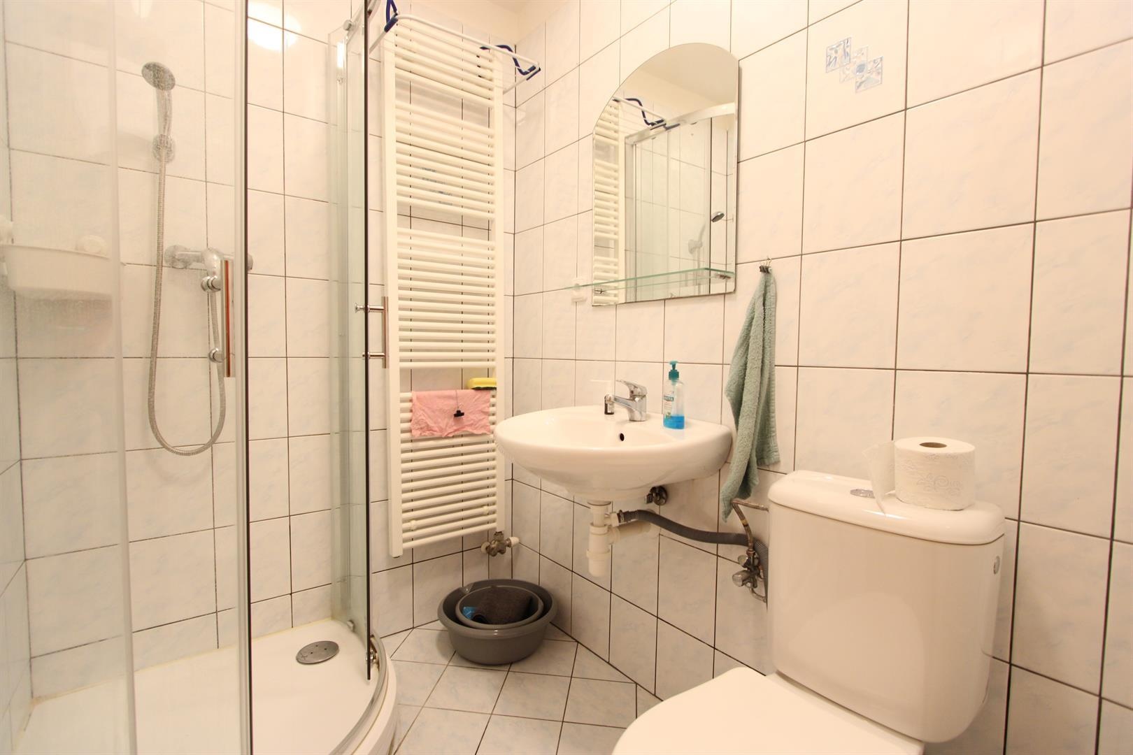 Koupelna se sprchovým koutem a toaletou je vybavena zrcadlem a otopným žebříkem.
