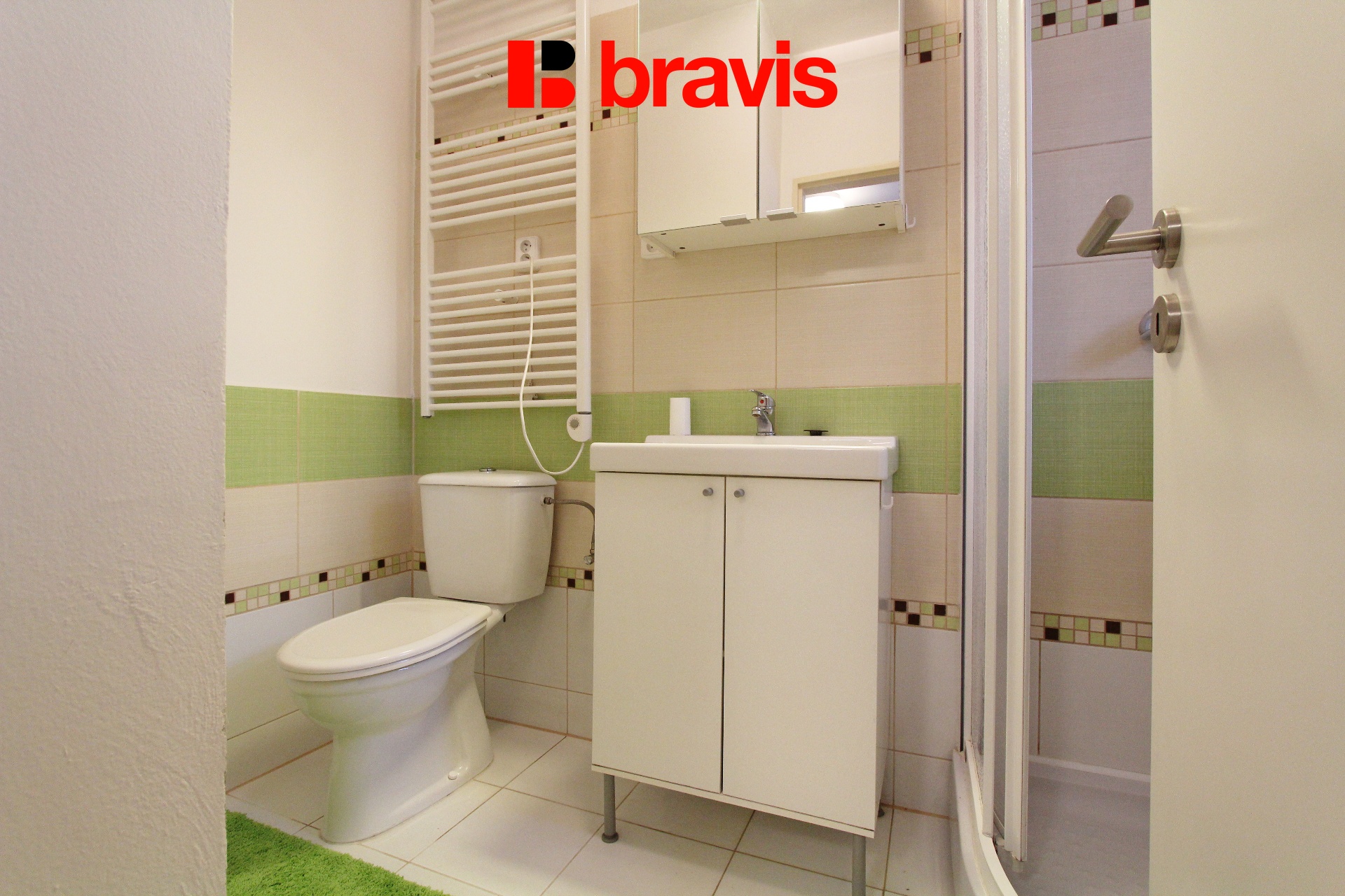 V koupelně je sprchový kout, umyvadlo, přípojka na pračku a toaleta.