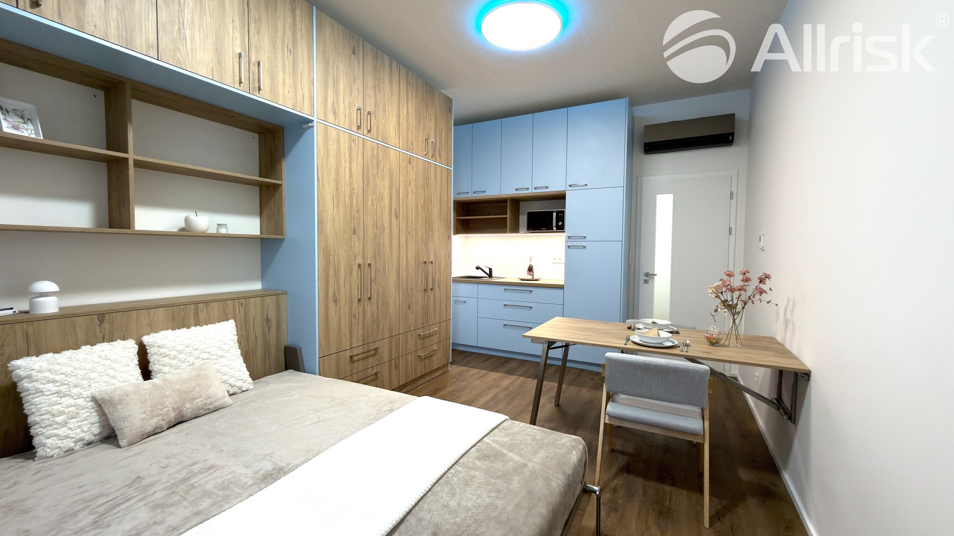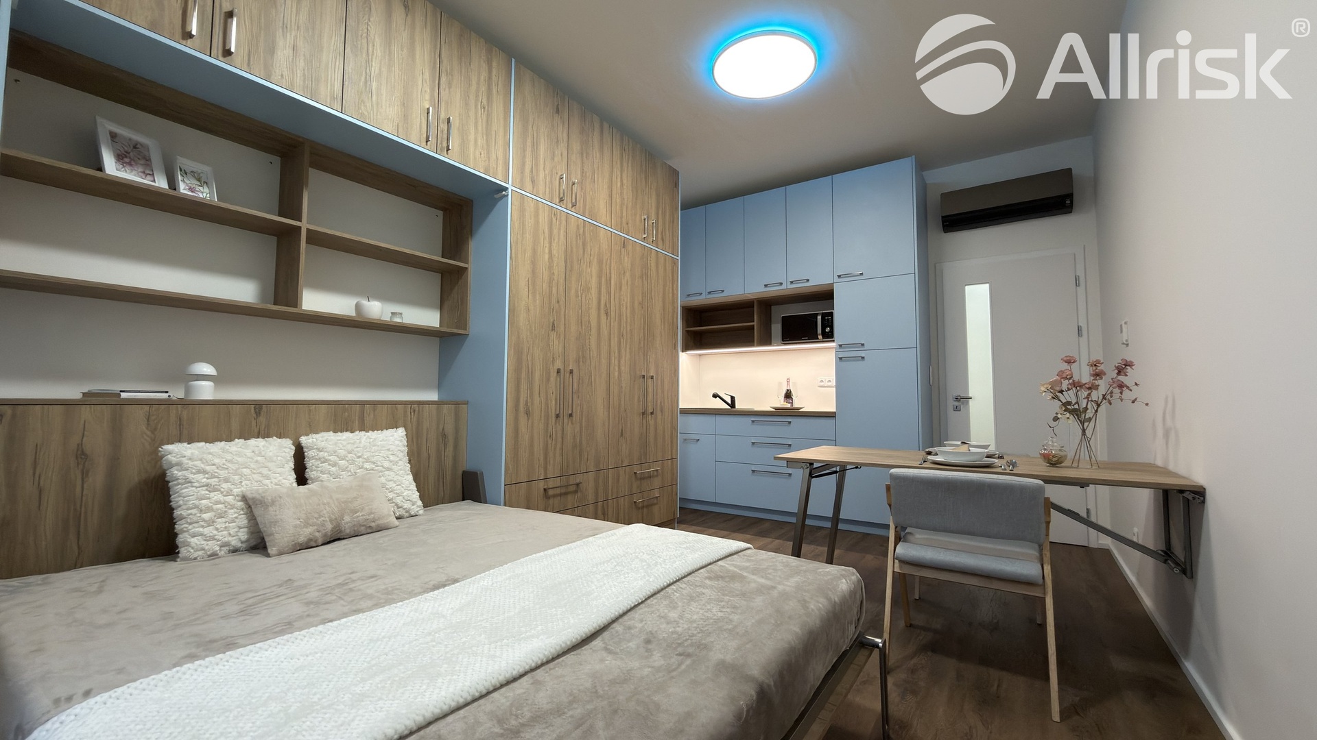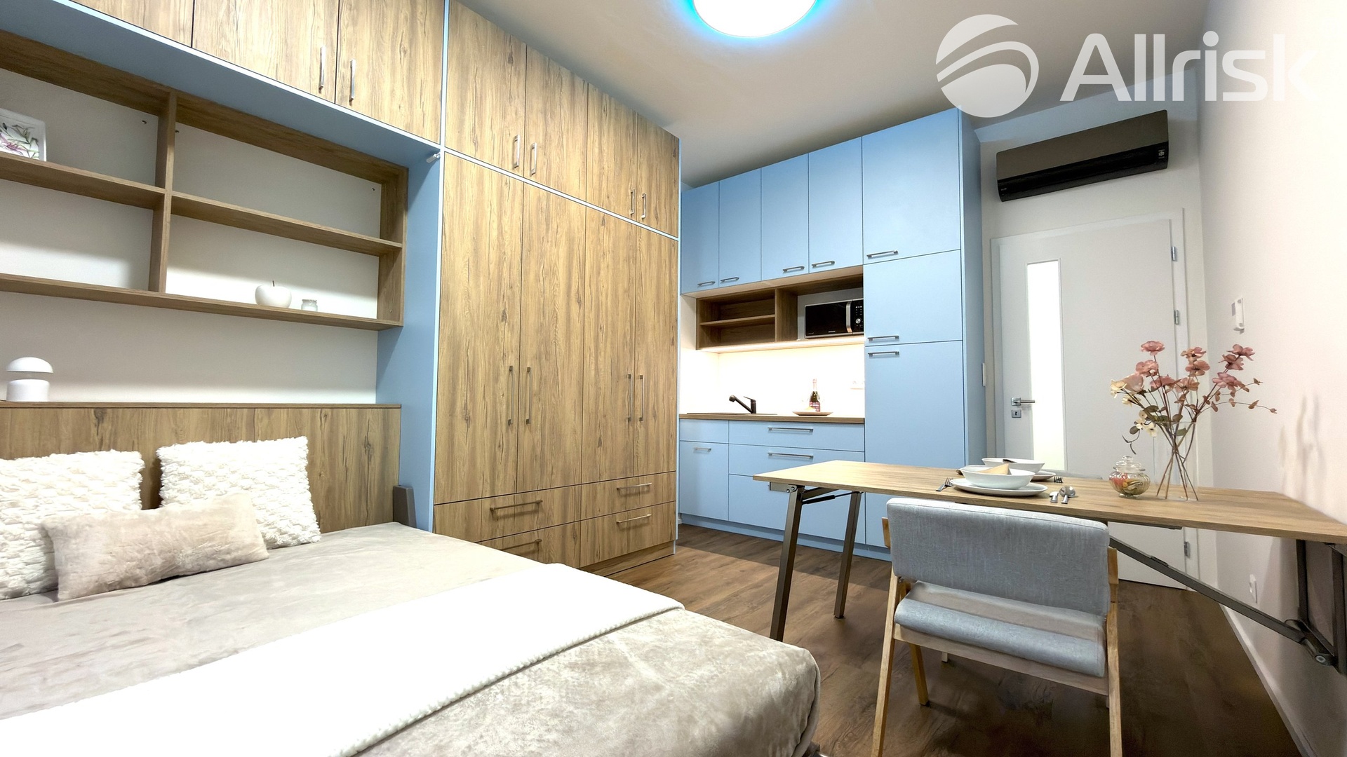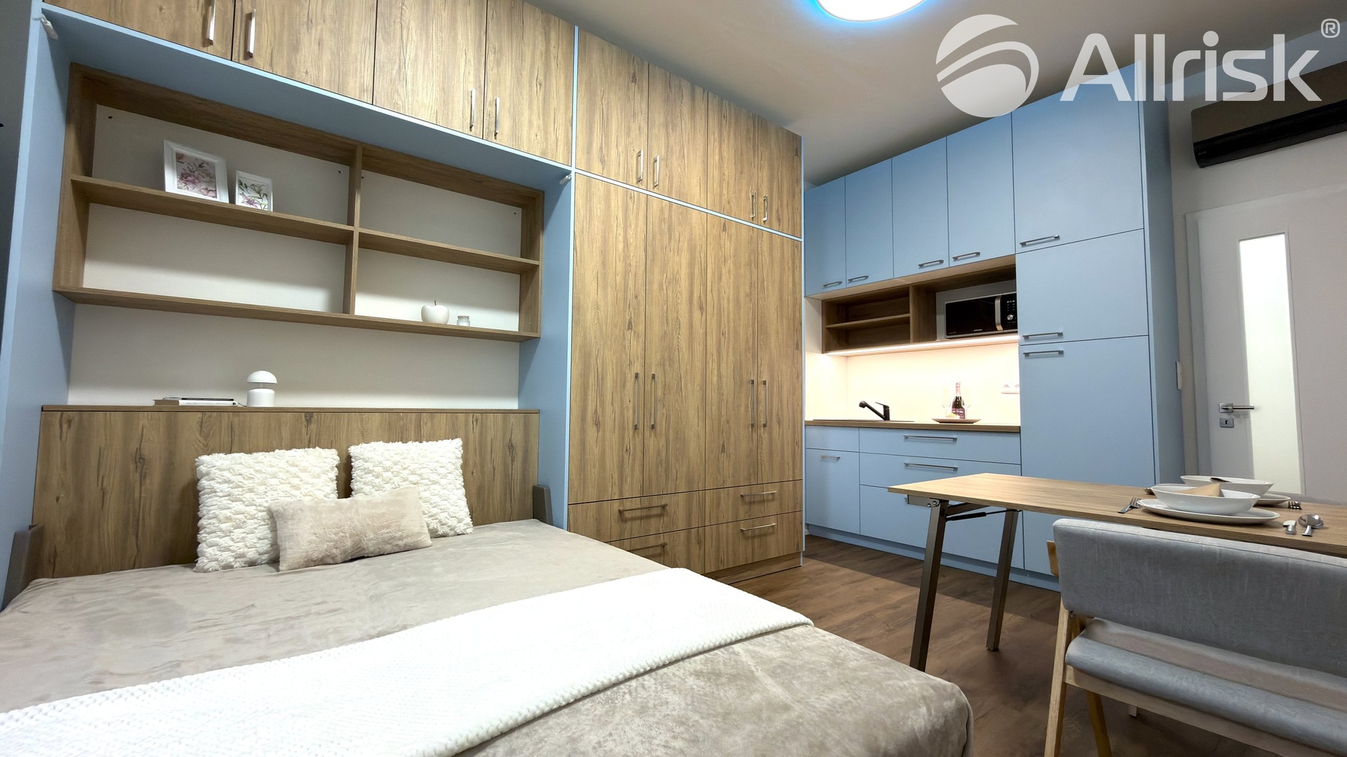 – na míru dělaná šatní stěna včetně skládací postele a skládacího prostorného stolu + dvě židličky.