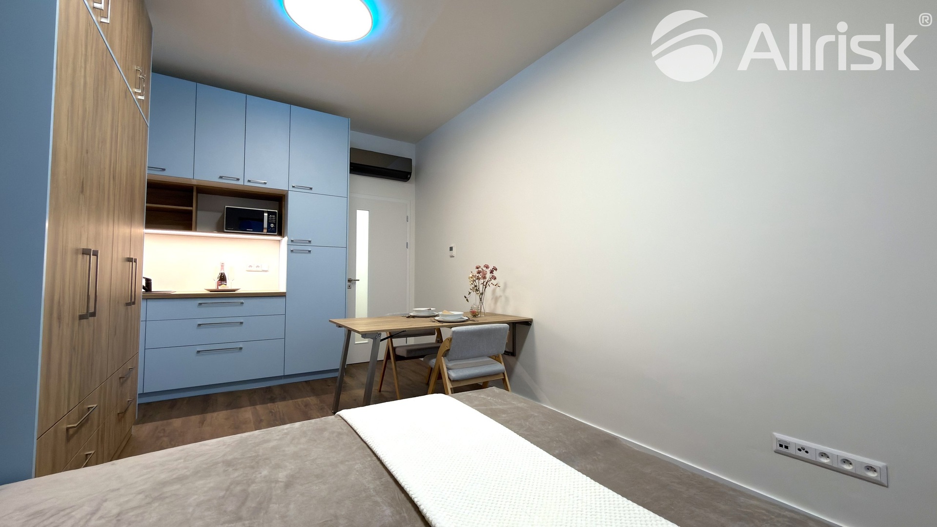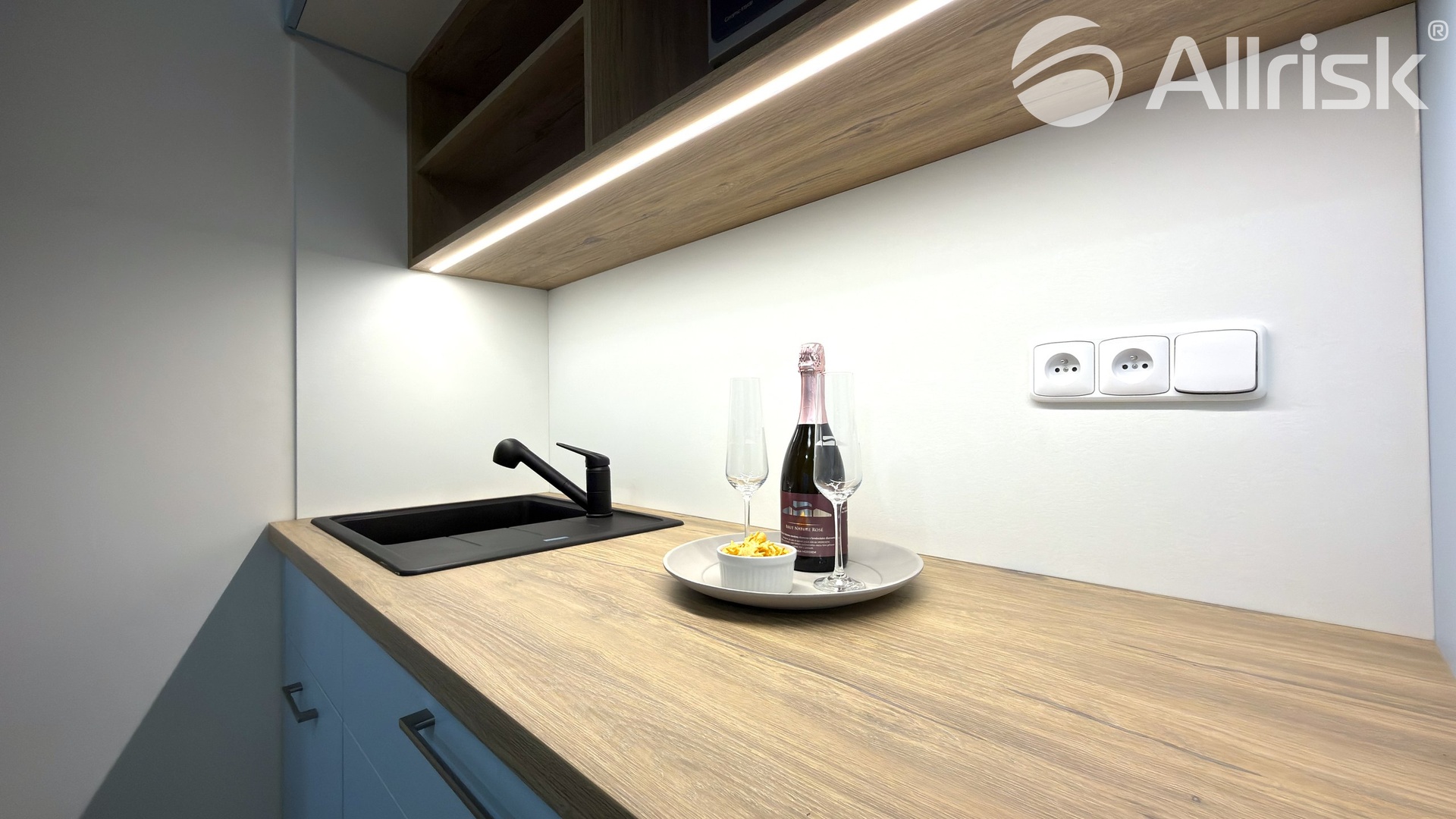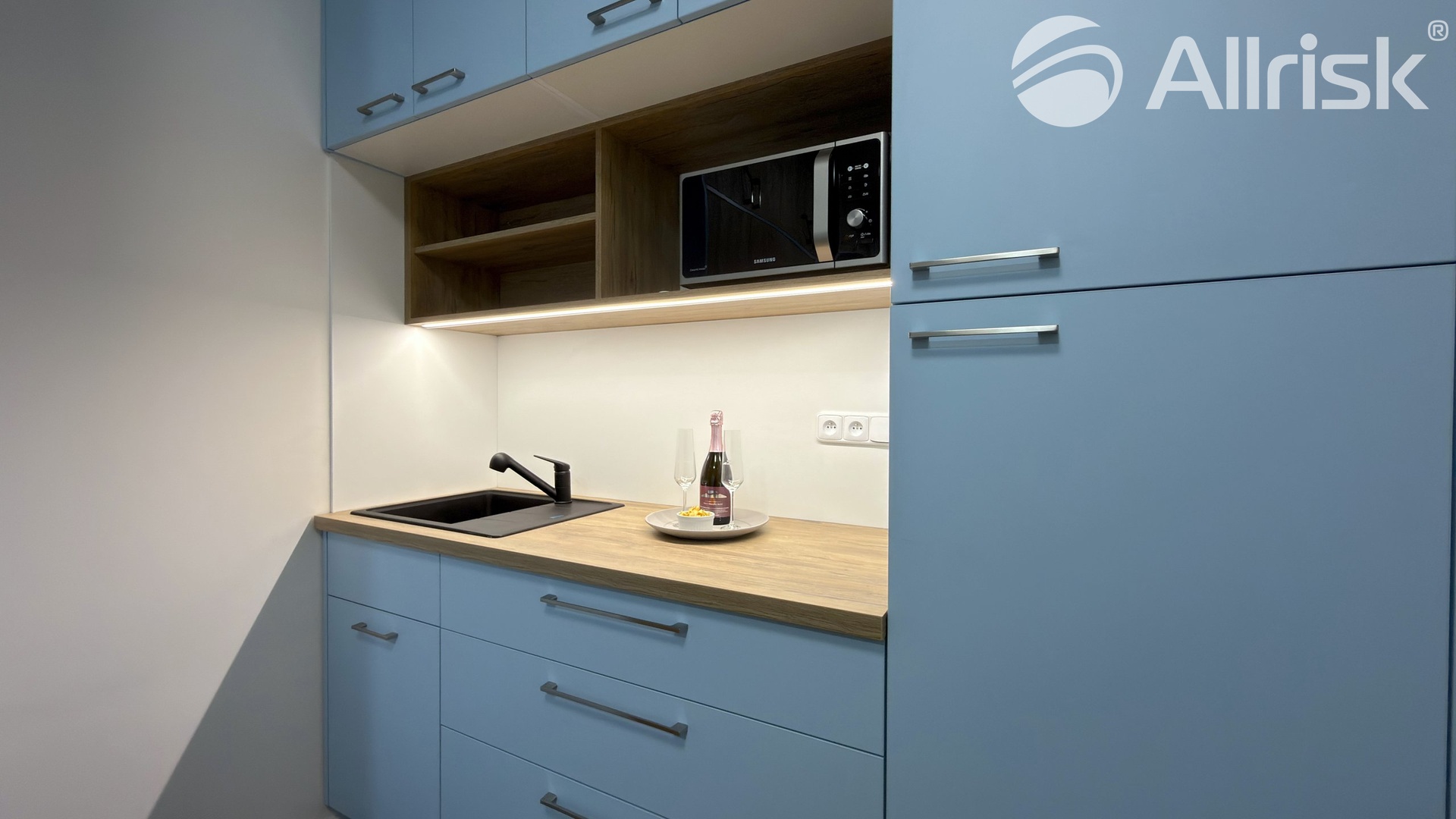 – kuchyňská linka včetně lednice, mikr. trouby, mobilní indukční plotýnky a digestoře