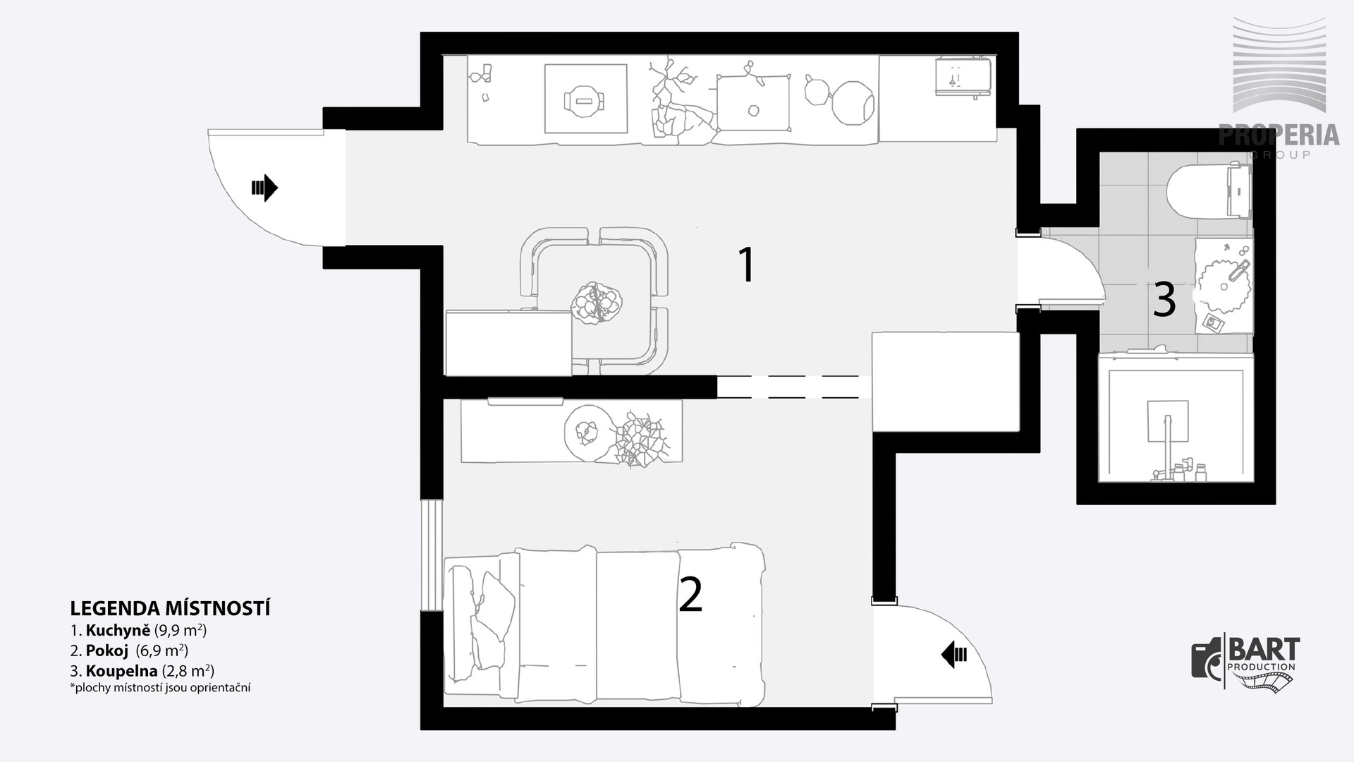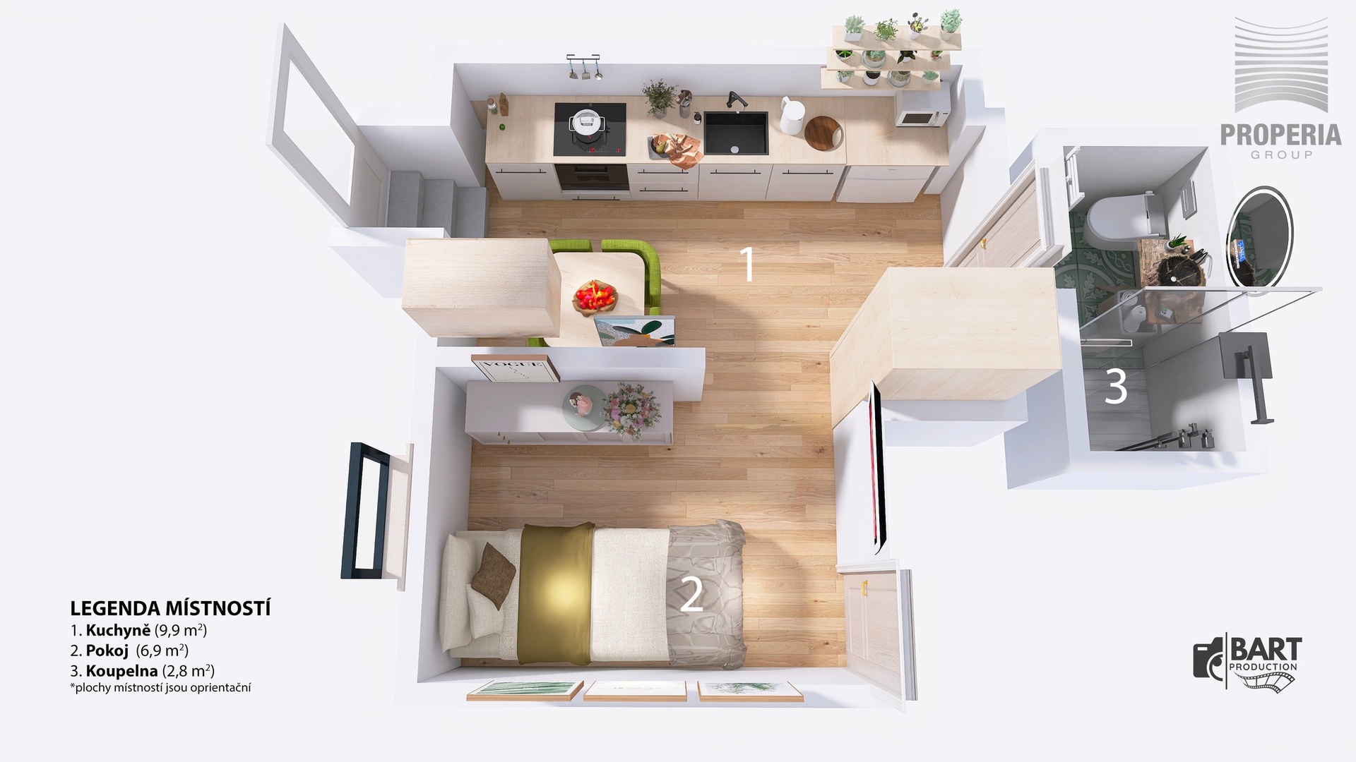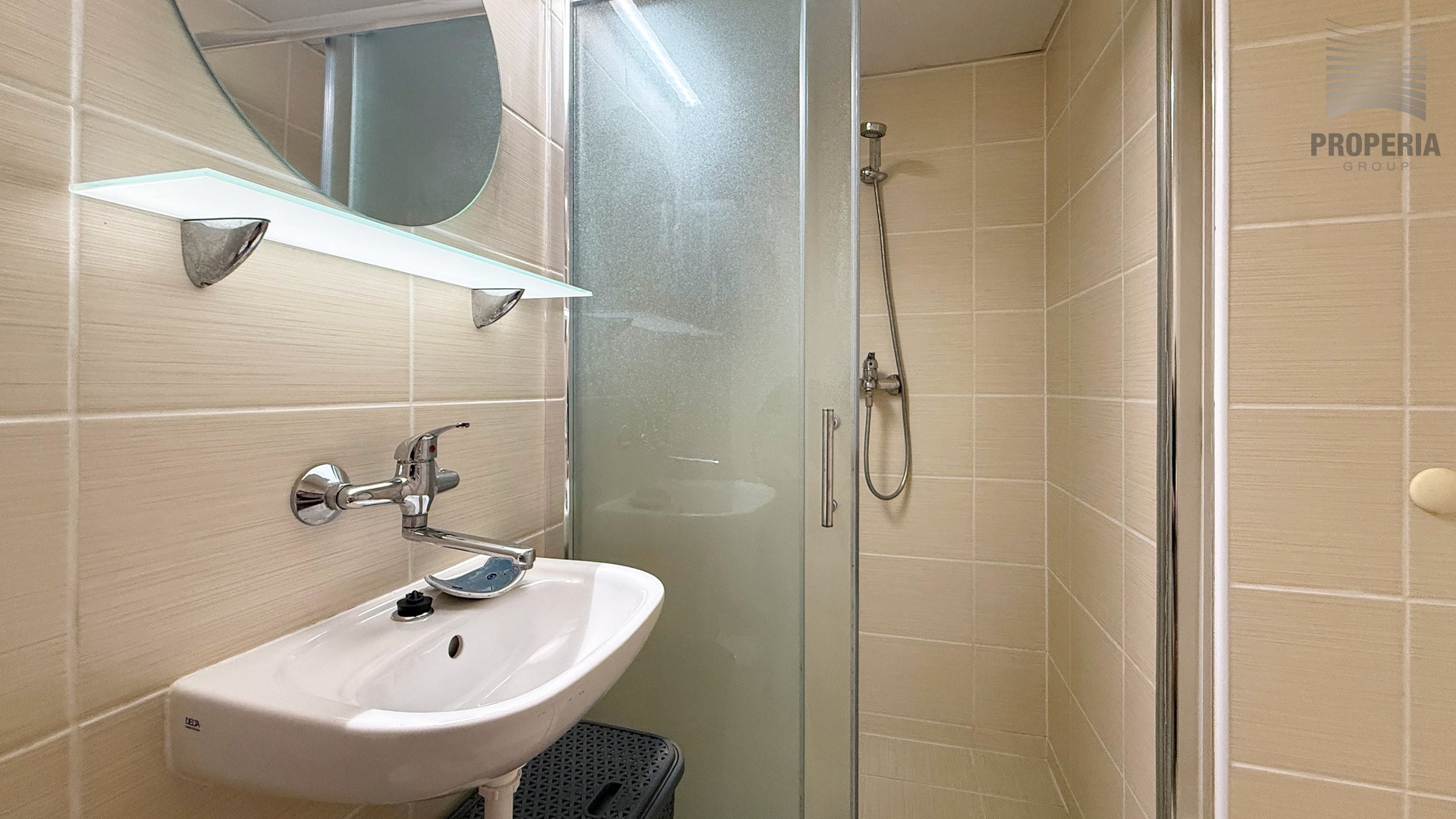 Dispozici tvoří hlavní obytný prostor s kuchyňskou linkou a posezením a koupelna se sprchovým koutem a WC. Byt se pronajímá kompletně vybavený, stačí se pouze nastěhovat.