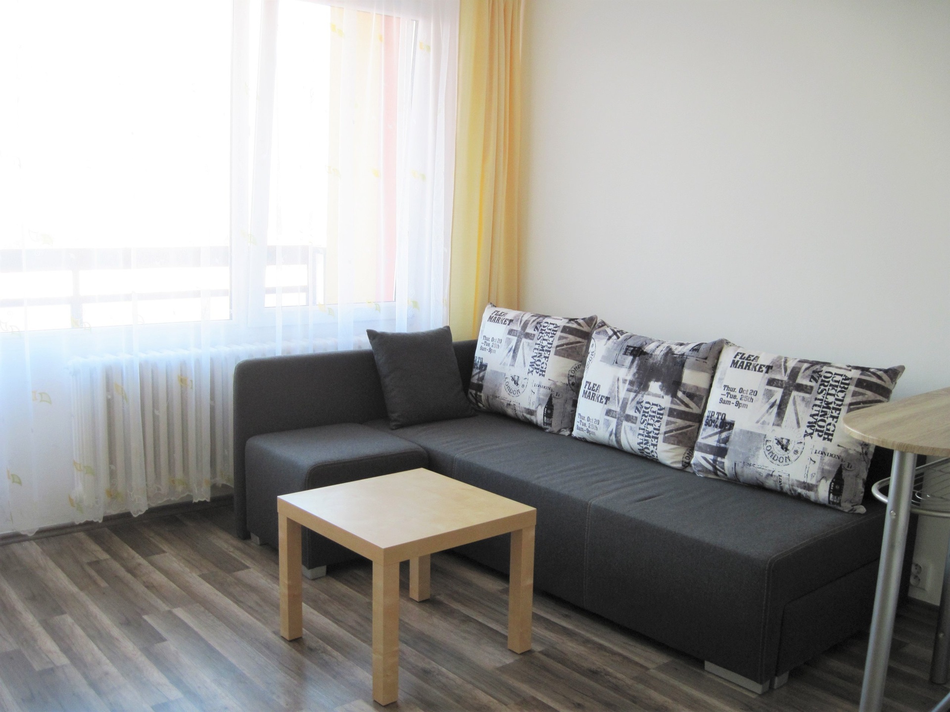 Součástí bytu je světlá obytná místnost s kuchyňskou linkou vybavenou elektrickou troubou, varnou deskou, digestoří a lednicí.