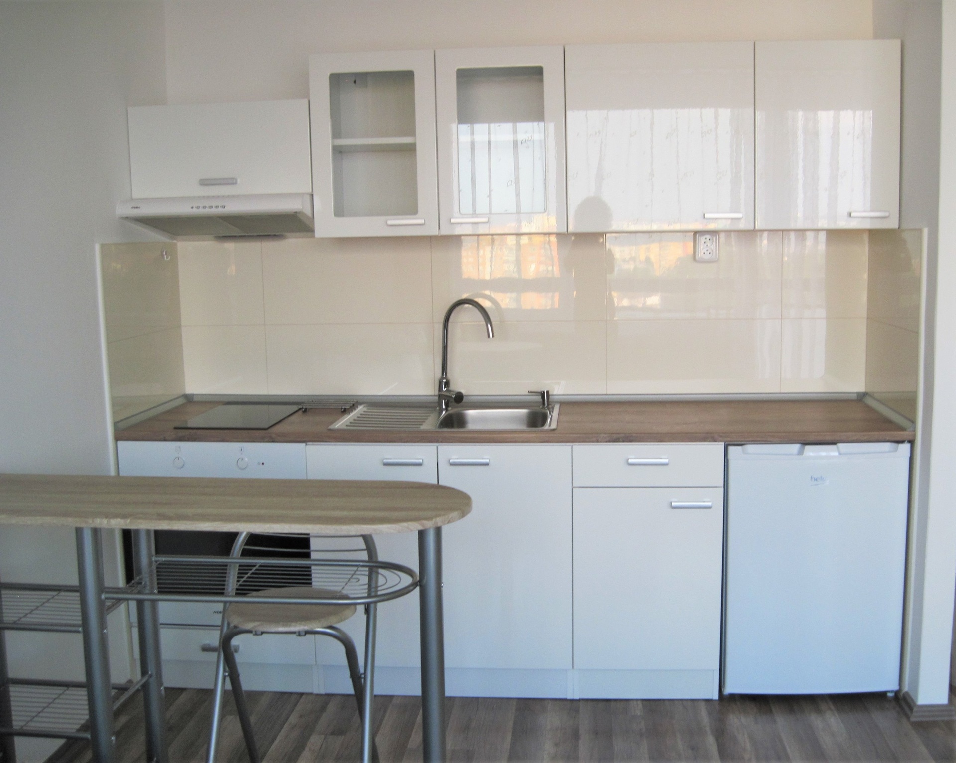 Součástí bytu je světlá obytná místnost s kuchyňskou linkou vybavenou elektrickou troubou, varnou deskou, digestoří a lednicí.