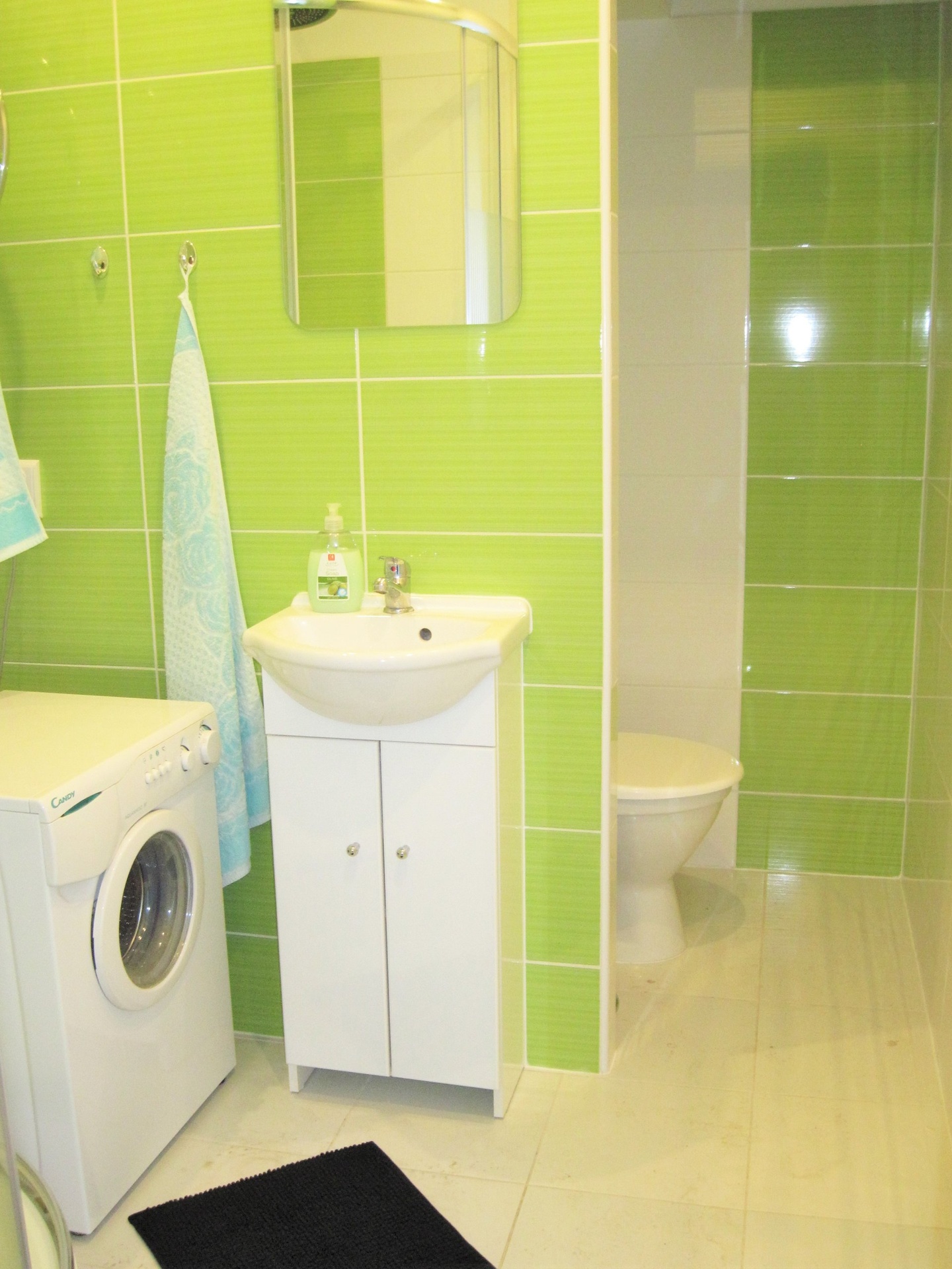 Koupelna se sprchovým koutem je spojena s toaletou a doplněná o umyvadlovou skříňku se zrcadlem. K bytu náleží i sklepní kóje, která rozšiřuje možnosti úložného prostoru.