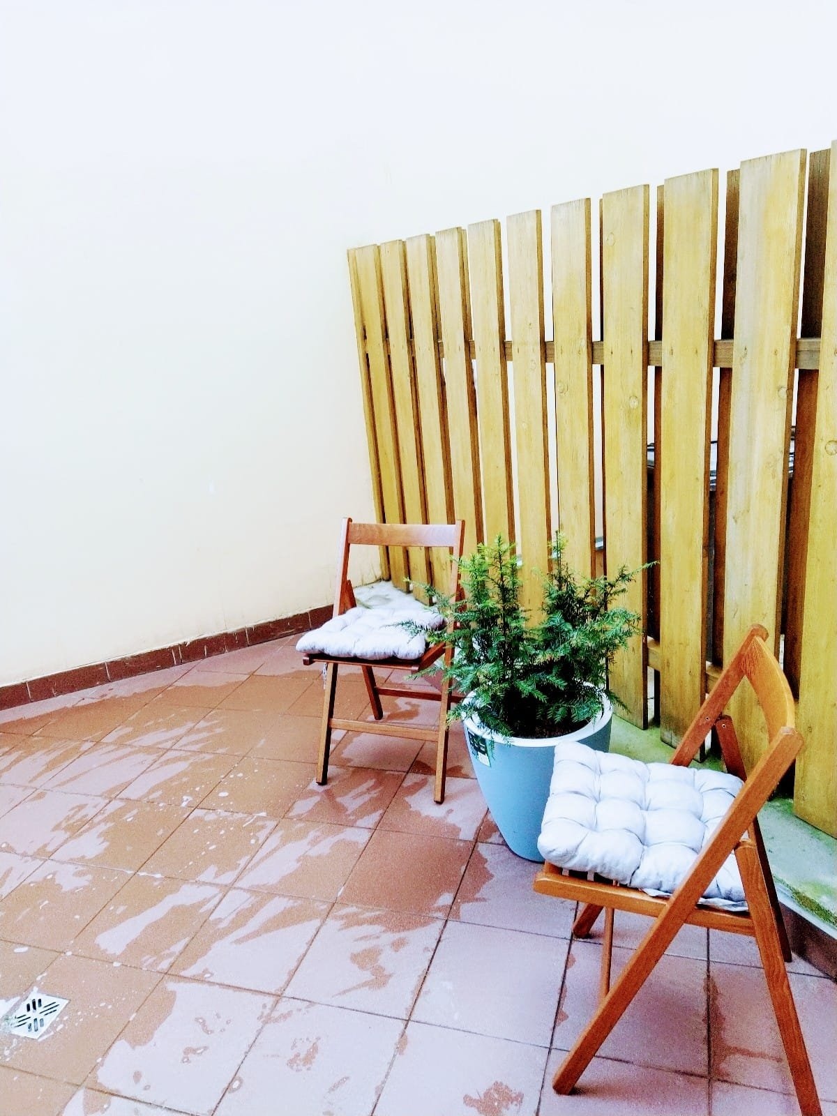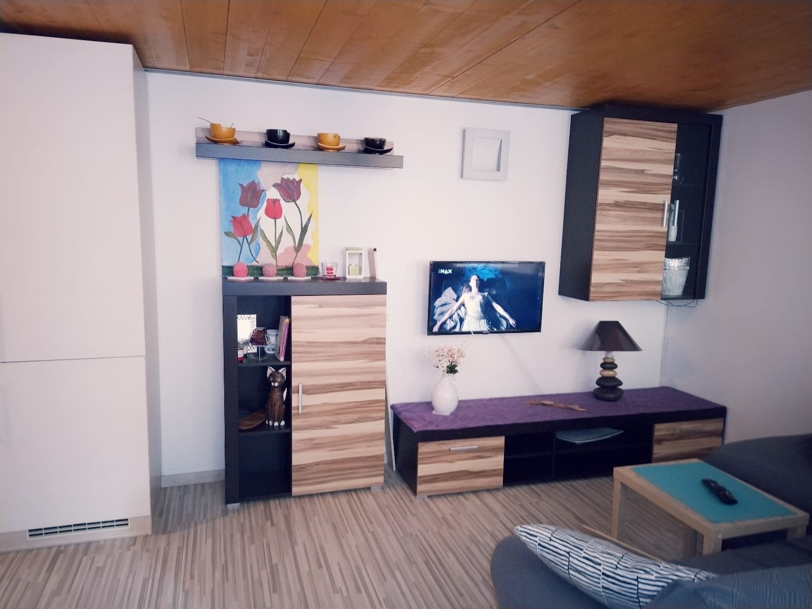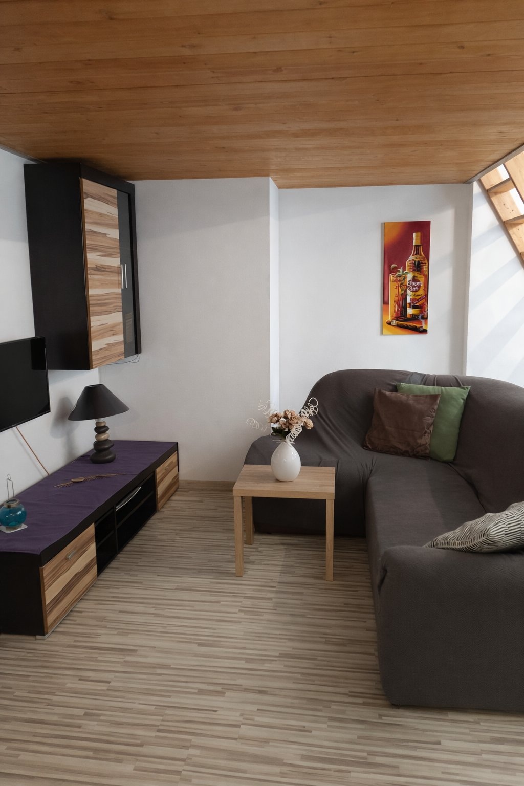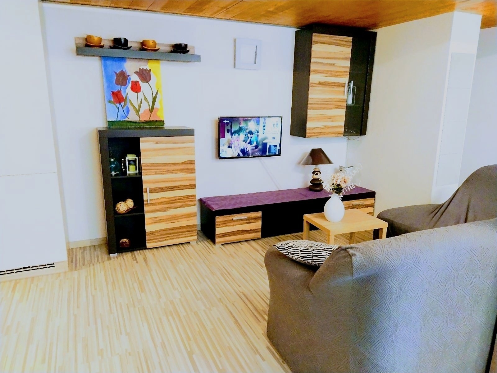 Obývací část pod spacím patrem je už zařízená – sedací souprava, obývací stěna a TV . Z pokoje jdete rovnou na terasu 9 m² (ta se do plochy nepočítá, ale na kafe je skvělá).