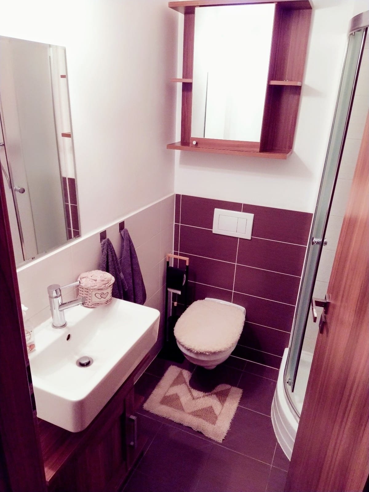 Koupelna se sprchovým koutem, WC je samostatně.