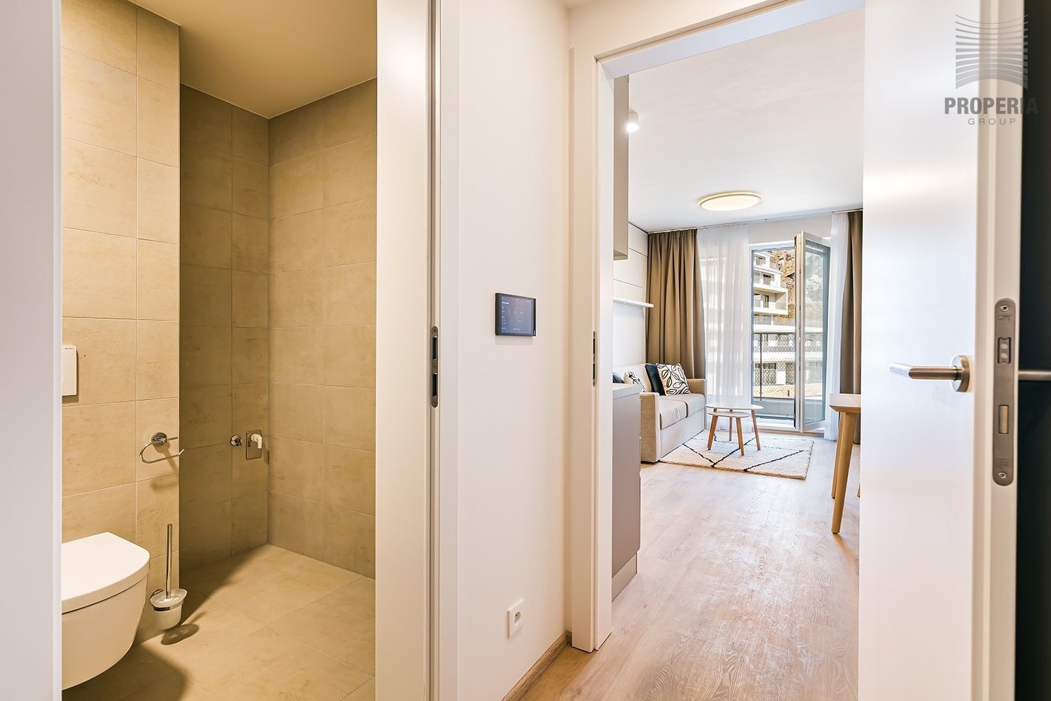 - balkon s výhledem do upraveného vnitrobloku a na skalní panorama s