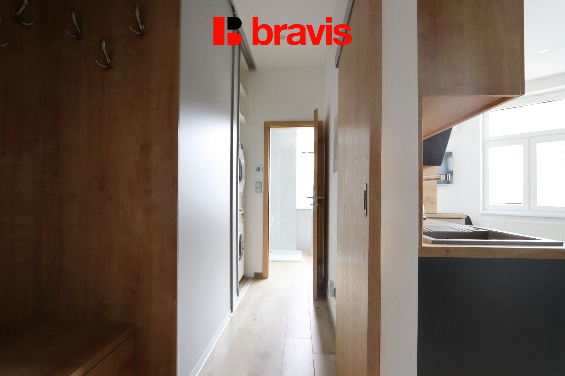 V předsíni se nachází vestavná skříň společně s pračkou a sušičkou.
