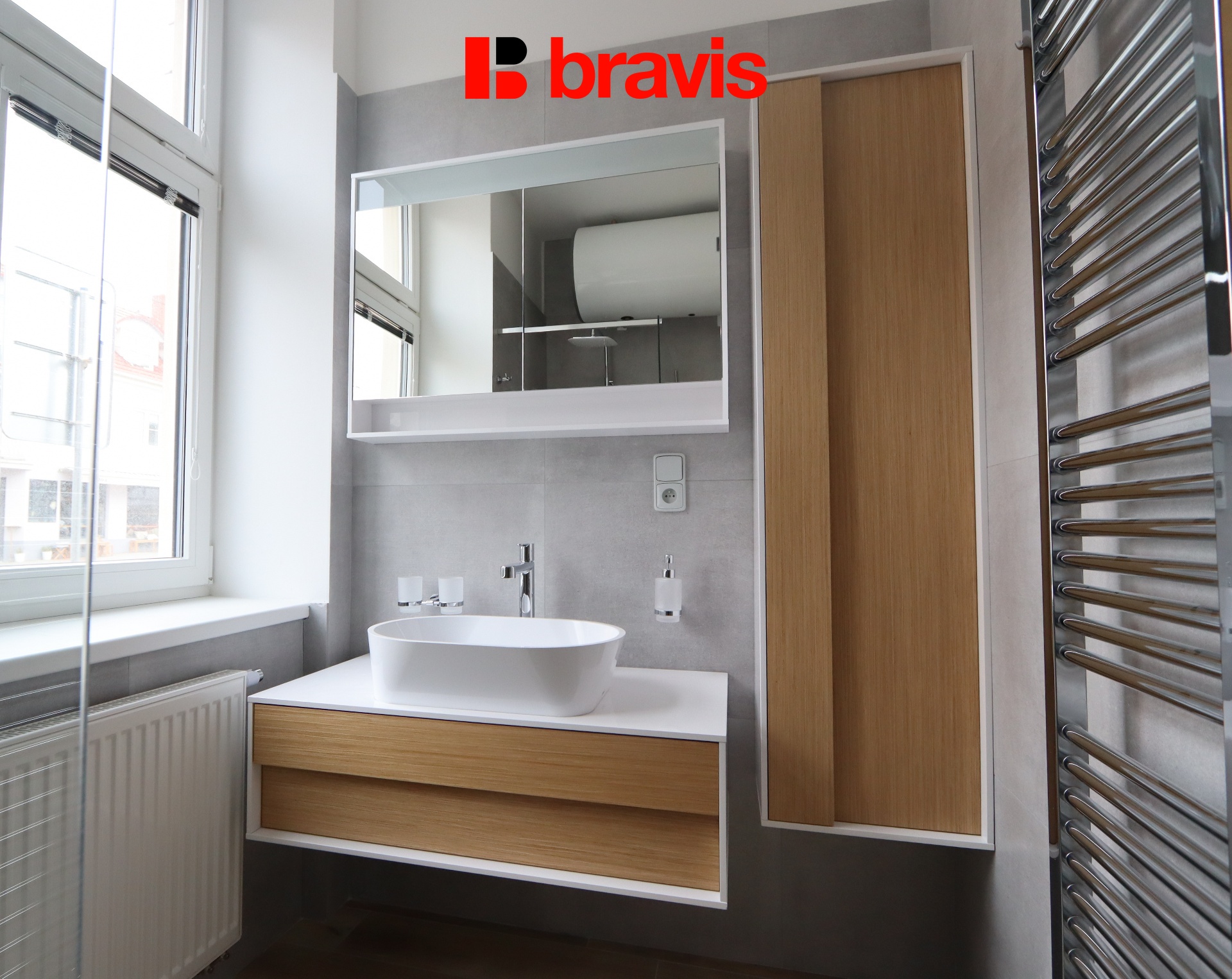 Koupelna je vybavena sprchovým koutem, umyvadlem, zrcadlem, otopným žebříkem a toaletou.