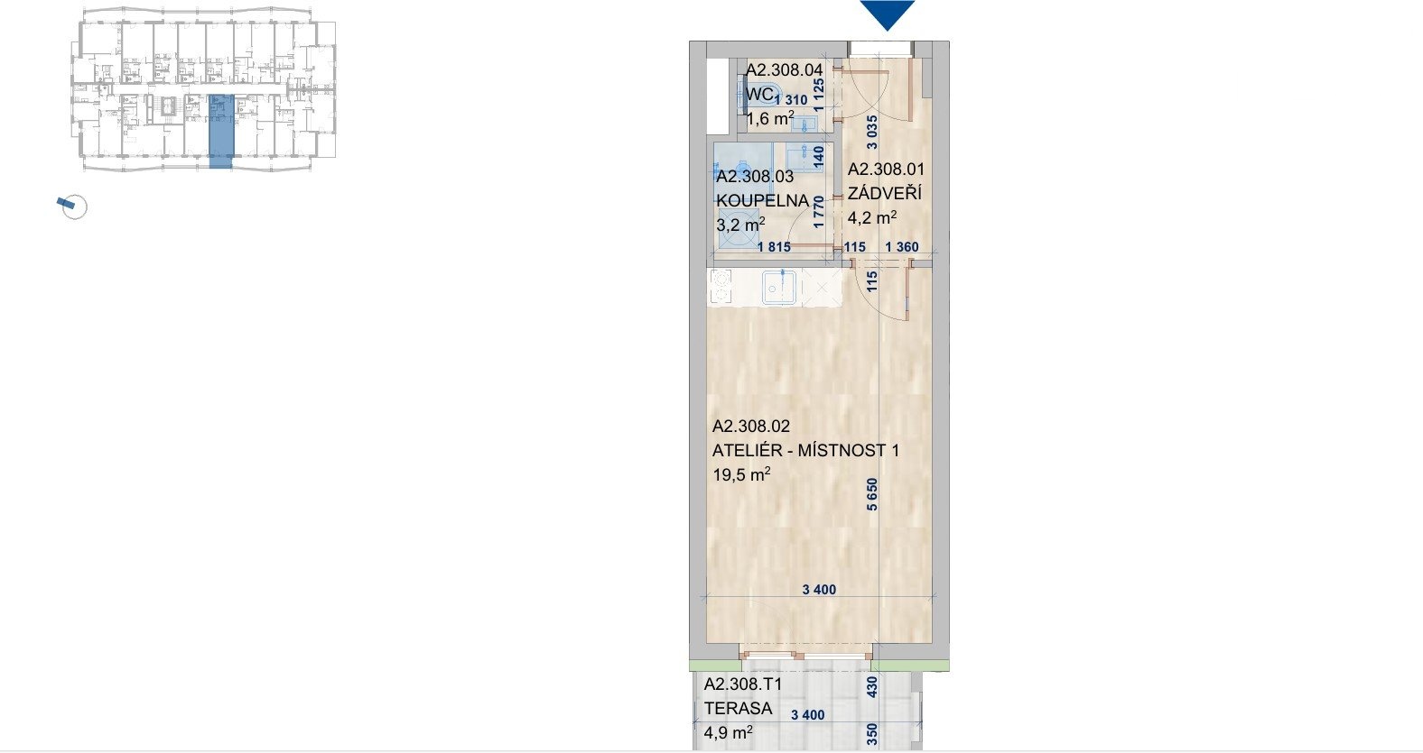 Dispozice ateliéru zahrnuje prostornou hlavní místnost s kuchyňským koutem, chodbu, koupelnu se sprchovým koutem a samostatné WC. Terasa je orientovaná na západ a nabízí příjemné místo pro relaxaci.