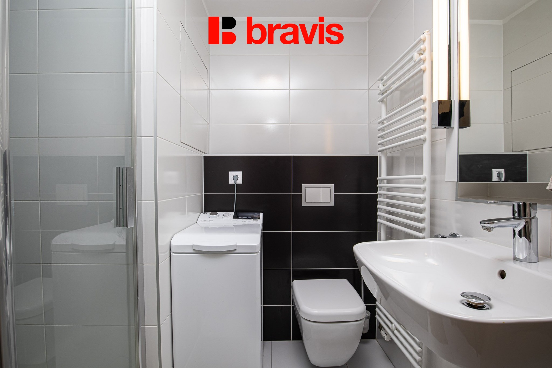V koupelně je sprchový kout, umyvadlo se skříňkou, pračka a toaleta.
