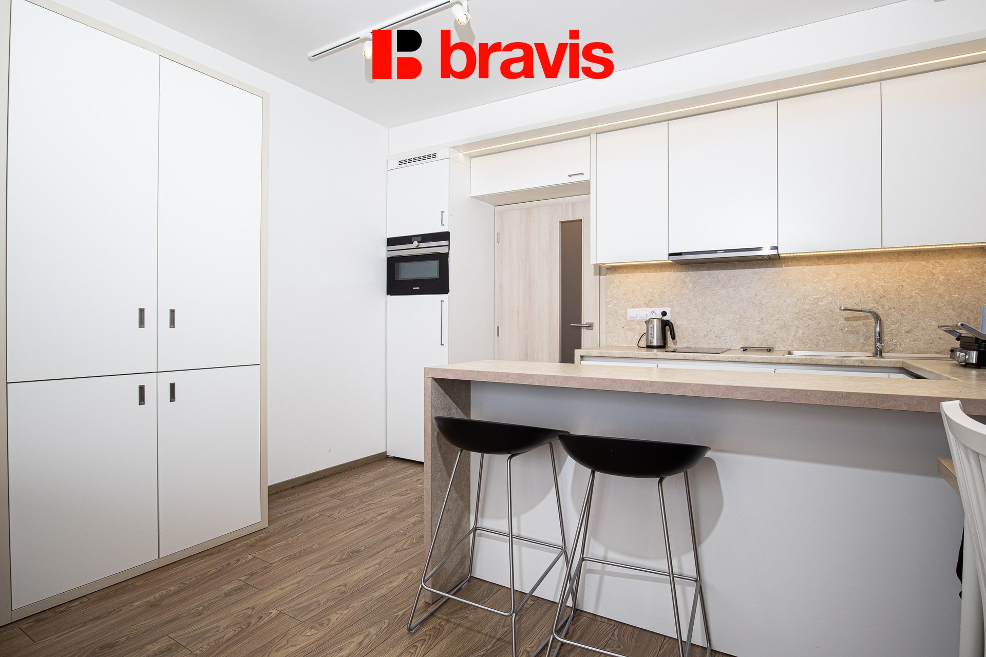 Kuchyňská linka je vybavená vestavěnými spotřebiči: varná deska, elektrická trouba, digestoř, lednice s mrazákem. Dále se zde nachází barový stůl se židlemi.